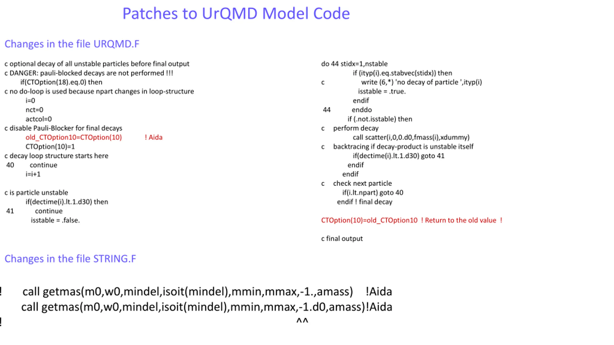 Patches to UrQMD Model Code Changes in the file URQMD.F c optional decay of all unstable particles before final output c DANGER: pauli-blocked decays are not performed !!! if(CTOption(18).eq.0) then c no do-loop is used because npart changes in loop-structure i=0 nct=0 actcol=0 c disable Pauli-Blocker for final decays old_CTOption10=CTOption(10) ! Aida CTOption(10)=1 c decay loop structure starts here 40 continue i=i+1 do 44 stidx=1,nstable if (ityp(i).eq.stabvec(stidx)) then c write (6,*) 'no decay of particle ',ityp(i) isstable = .true. endif 44 enddo if (.not.isstable) then c perform decay call scatter(i,0,0.d0,fmass(i),xdummy) c backtracing if decay-product is unstable itself if(dectime(i).lt.1.d30) goto 41 endif endif c check next particle if(i.lt.npart) goto 40 endif ! final decay c is particle unstable if(dectime(i).lt.1.d30) then 41 continue isstable = .false. CTOption(10)=old_CTOption10 ! Return to the old value ! c final output Changes in the file STRING.F ! call getmas(m0,w0,mindel,isoit(mindel),mmin,mmax,-1.,amass) !Aida call getmas(m0,w0,mindel,isoit(mindel),mmin,mmax,-1.d0,amass)!Aida ! ^^