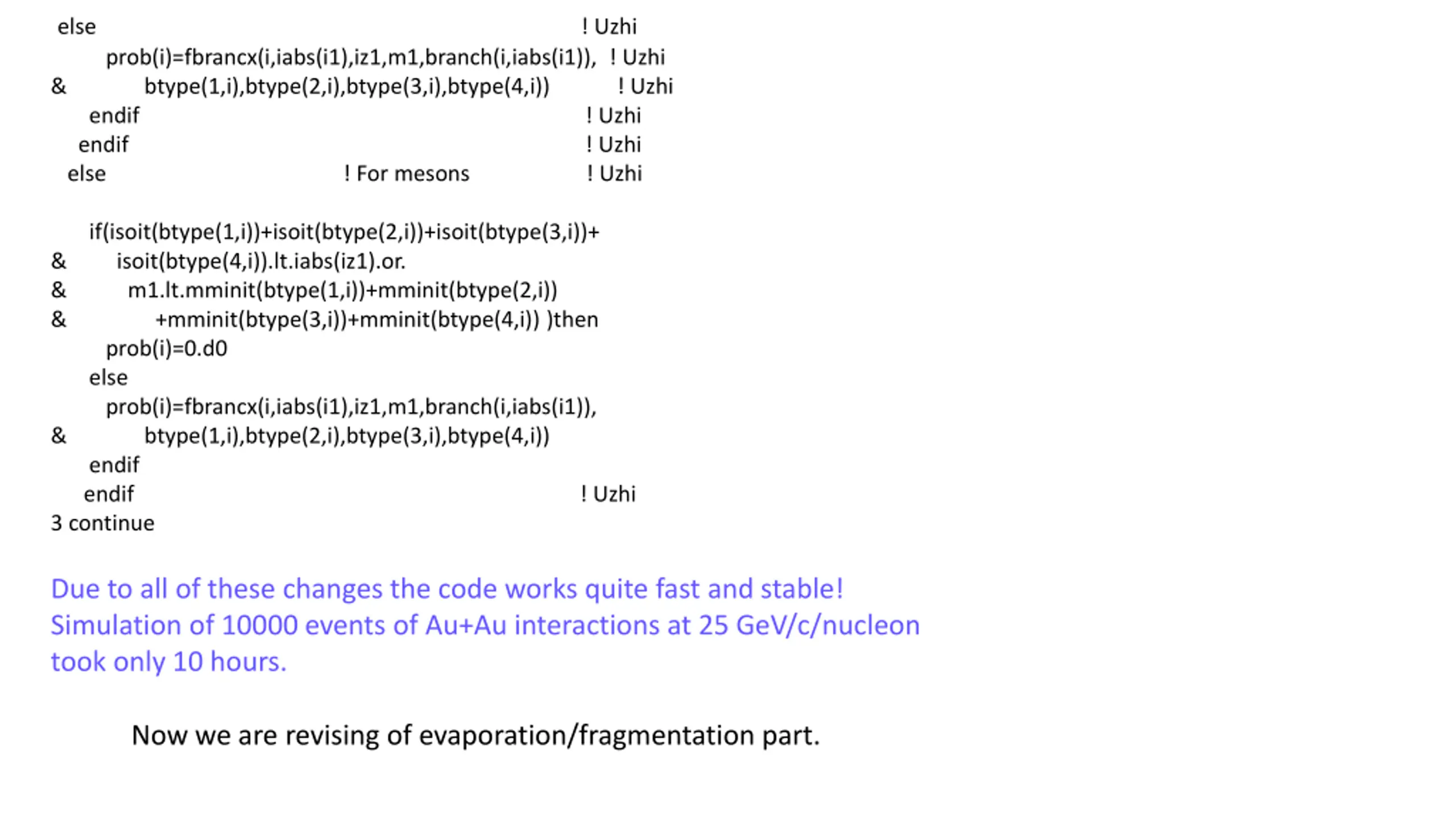 else ! Uzhi prob(i)=fbrancx(i,iabs(i1),iz1,m1,branch(i,iabs(i1)), ! Uzhi & btype(1,i),btype(2,i),btype(3,i),btype(4,i)) endif endif else ! For mesons ! Uzhi ! Uzhi ! Uzhi ! Uzhi if(isoit(btype(1,i))+isoit(btype(2,i))+isoit(btype(3,i))+ & isoit(btype(4,i)).lt.iabs(iz1).or. & m1.lt.mminit(btype(1,i))+mminit(btype(2,i)) & +mminit(btype(3,i))+mminit(btype(4,i)) )then prob(i)=0.d0 else prob(i)=fbrancx(i,iabs(i1),iz1,m1,branch(i,iabs(i1)), & btype(1,i),btype(2,i),btype(3,i),btype(4,i)) endif endif 3 continue ! Uzhi Due to all of these changes the code works quite fast and stable! Simulation of 10000 events of Au+Au interactions at 25 GeV/c/nucleon took only 10 hours. Now we are revising of evaporation/fragmentation part.