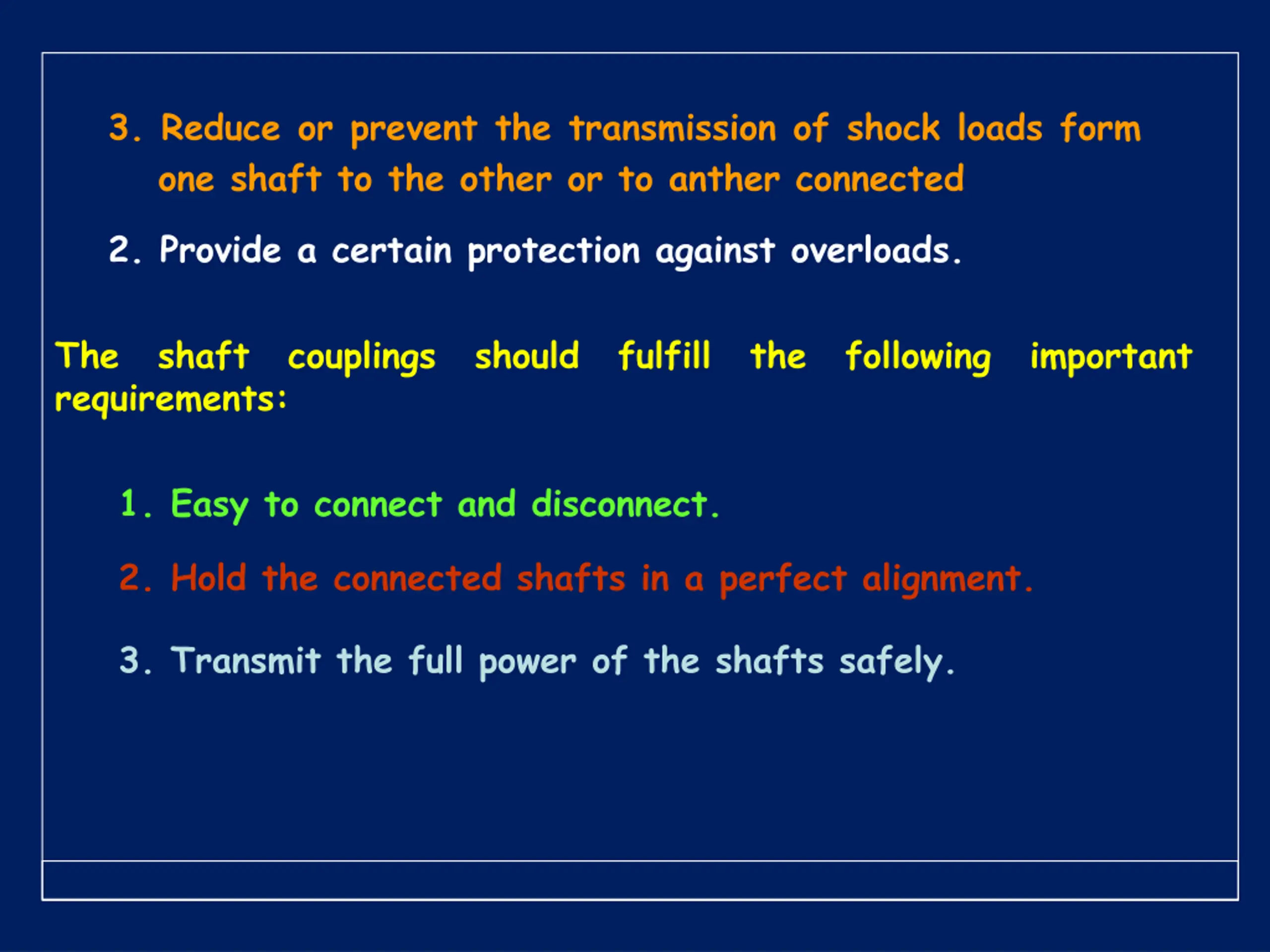 3. Reduce or prevent the transmission of shock loads form one shaft to the other or to anther connected 2. Provide a certain protection against overloads. The shaft couplings should fulfill the following important requirements: 1. Easy to connect and disconnect. 2. Hold the connected shafts in a perfect alignment. 3. Transmit the full power of the shafts safely.