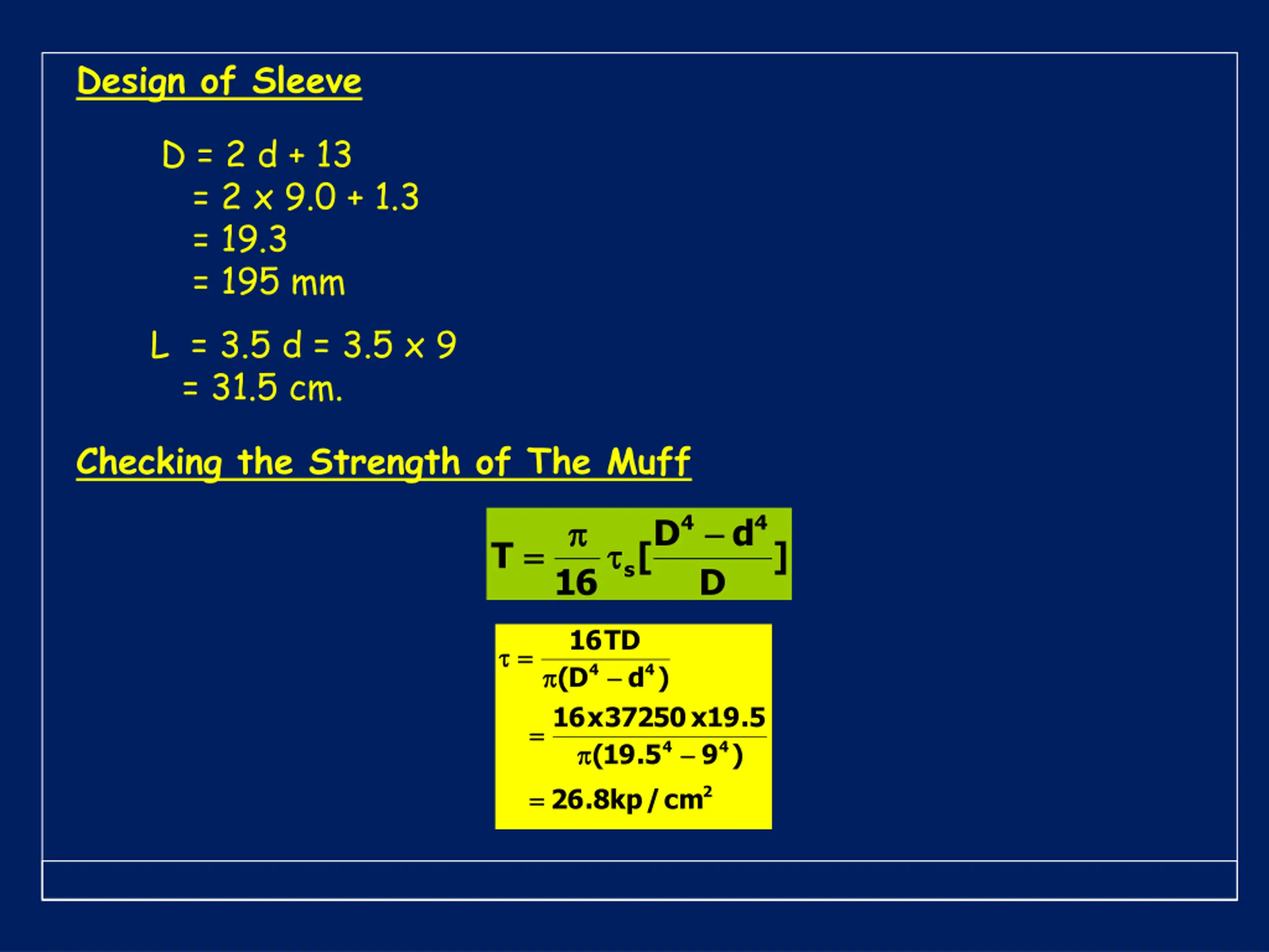 Design of Sleeve D = 2 d + 13 = 2 x 9.0 + 1.3 = 19.3 = 195 mm L = 3.5 d = 3.5 x 9 = 31.5 cm. Checking the Strength of The Muff 4 4 D d = = T [ ] s 16 D 16 TD = = 4 4 ( D d ) 16 x 37250 19 x 5 . = = 4 4 19 ( . 5 9 ) 2 = = 26 8 . kp / cm