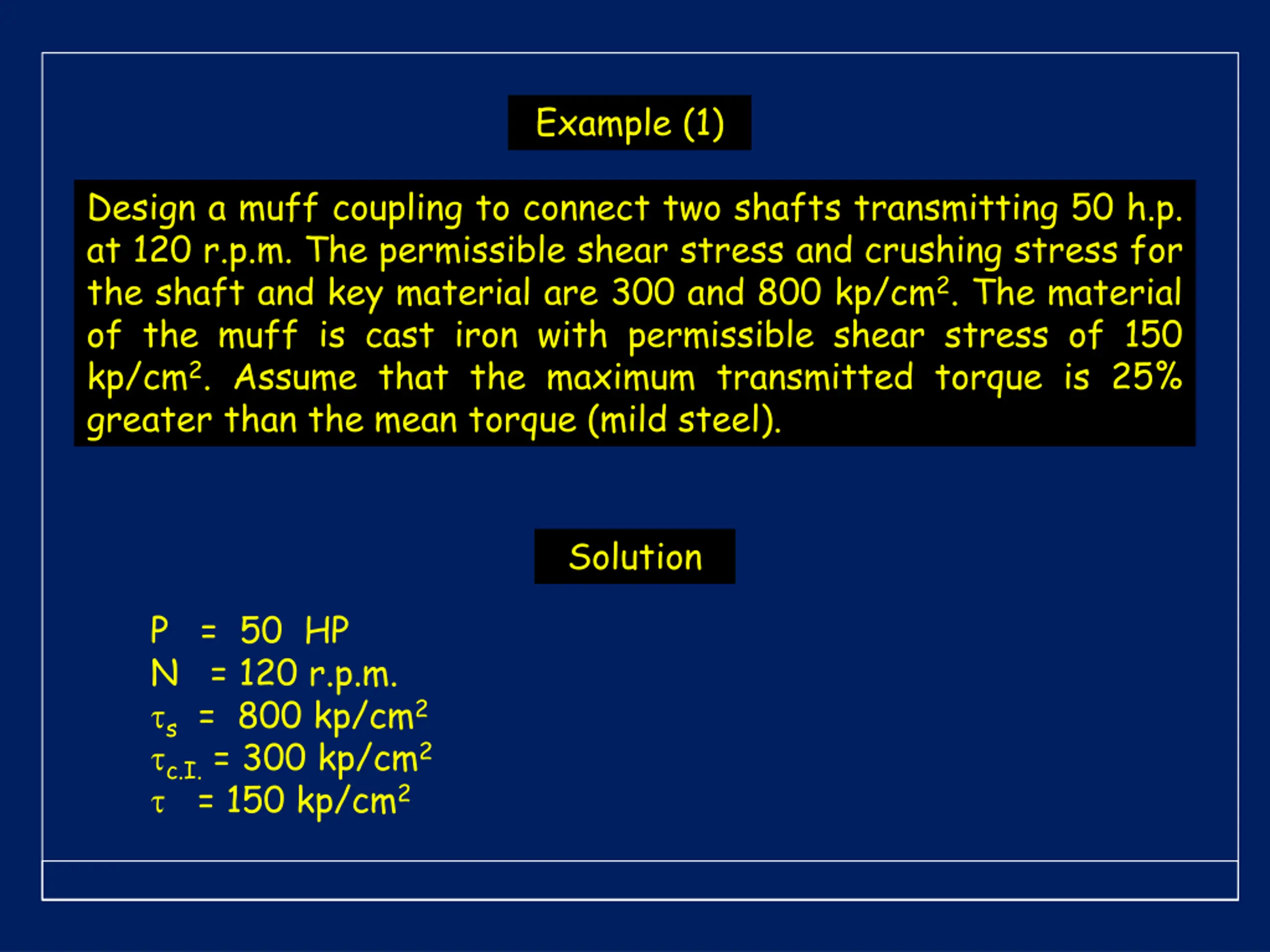 Example (1) Design a muff coupling to connect two shafts transmitting 50 h.p. at 120 r.p.m. The permissible shear stress and crushing stress for the shaft and key material are 300 and 800 kp/cm2. The material of the muff is cast iron with permissible shear stress of 150 kp/cm2. Assume that the maximum transmitted torque is 25% greater than the mean torque (mild steel). Solution P = 50 HP N = 120 r.p.m. s= 800 kp/cm2 c.I.= 300 kp/cm2 = 150 kp/cm2