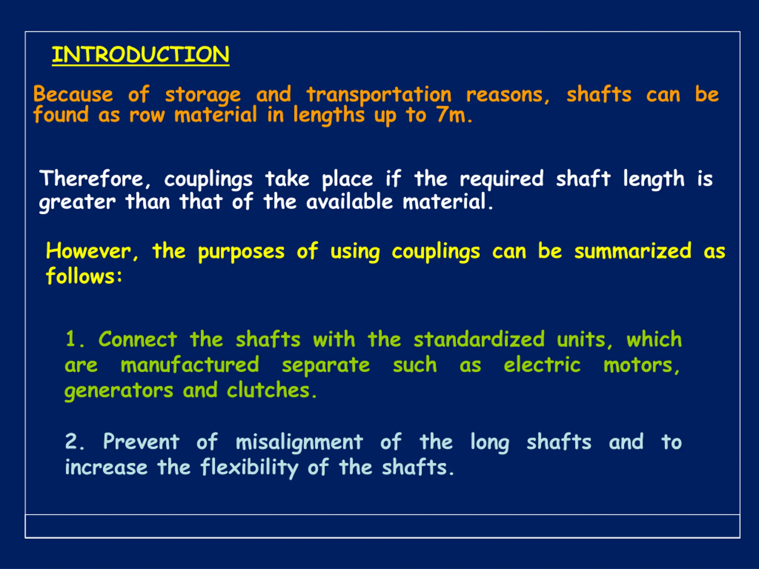INTRODUCTION Because of storage and transportation reasons, shafts can be found as row material in lengths up to 7m. Therefore, couplings take place if the required shaft length is greater than that of the available material. However, the purposes of using couplings can be summarized as follows: 1. Connect the shafts with the standardized units, which are manufactured separate such as electric motors, generators and clutches. 2. Prevent of misalignment of the long shafts and to increase the flexibility of the shafts.
