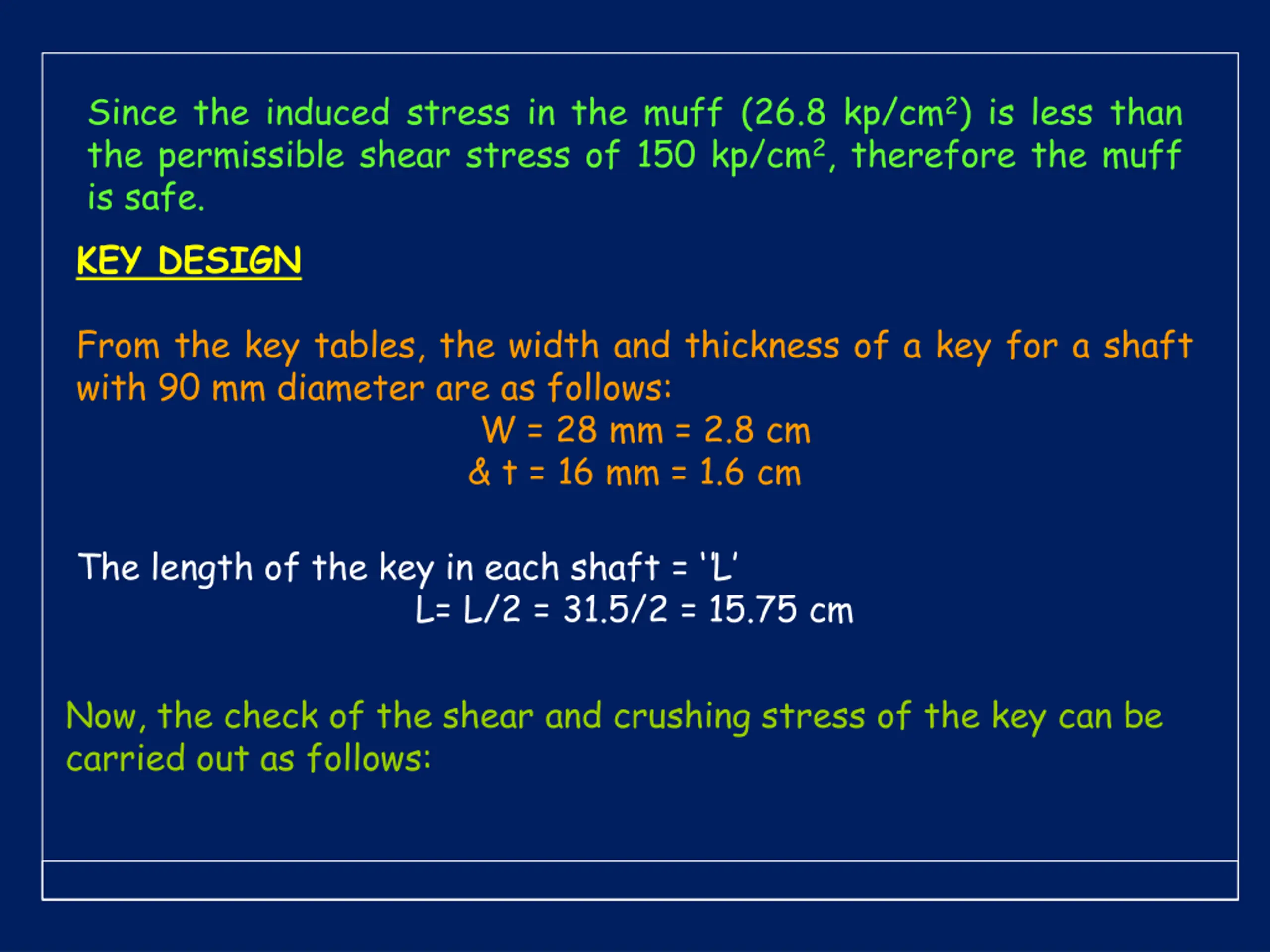 Since the induced stress in the muff (26.8 kp/cm2) is less than the permissible shear stress of 150 kp/cm2, therefore the muff is safe. KEY DESIGN From the key tables, the width and thickness of a key for a shaft with 90 mm diameter are as follows: W = 28 mm = 2.8 cm & t = 16 mm = 1.6 cm The length of the key in each shaft = L L= L/2 = 31.5/2 = 15.75 cm Now, the check of the shear and crushing stress of the key can be carried out as follows:
