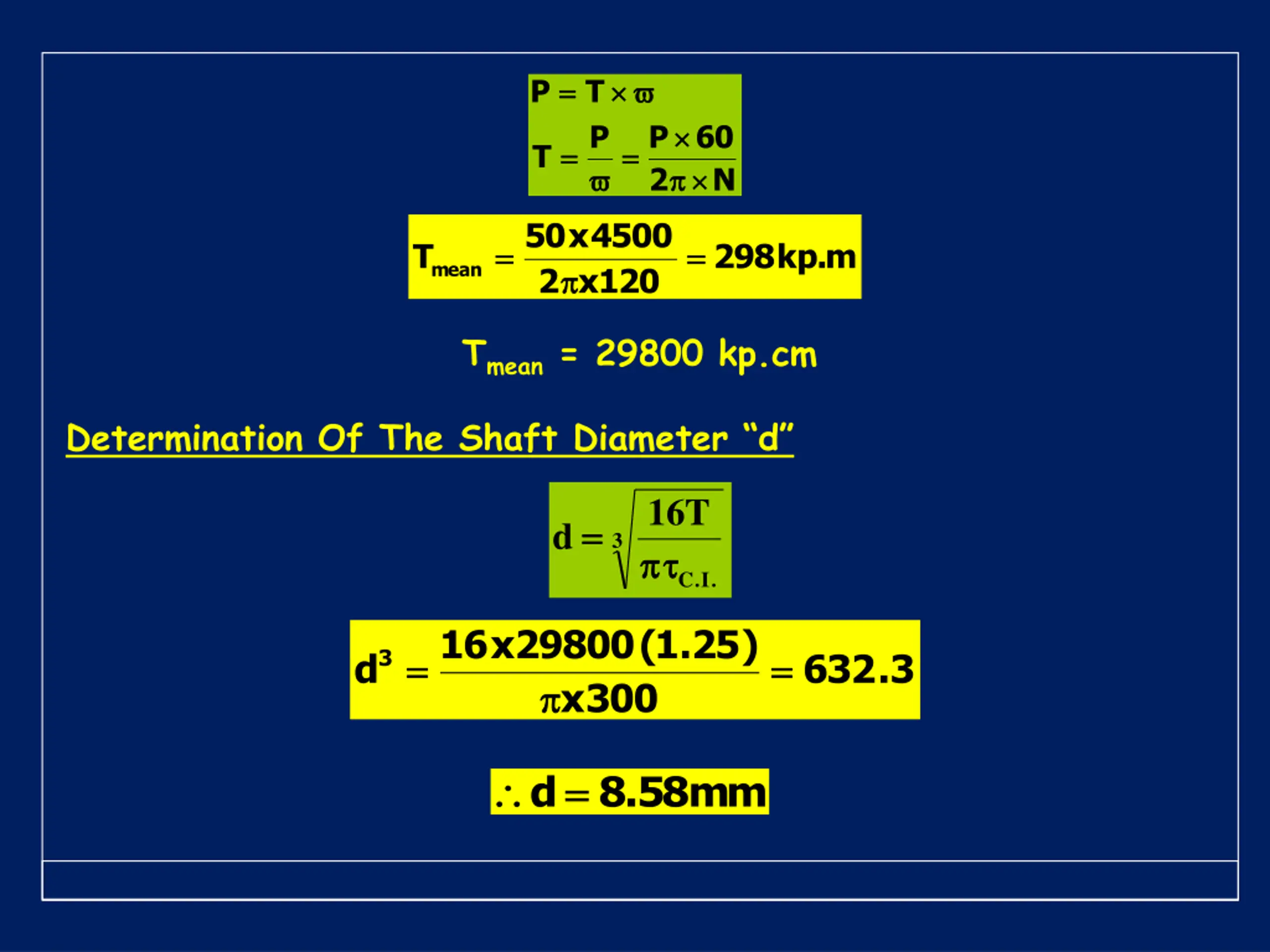 = = P T P P 60 = = = = T 2 N 50 x 4500 = = = = Tmean 298 kp m . 120 x 2 Tmean= 29800 kp.cm Determination Of The Shaft Diameter d 16 T = = d 3 . I . C 16 29800 x 25 . 1 ( ) d3 = = = = 632 3 . x 300 d= = 58 . 8 mm