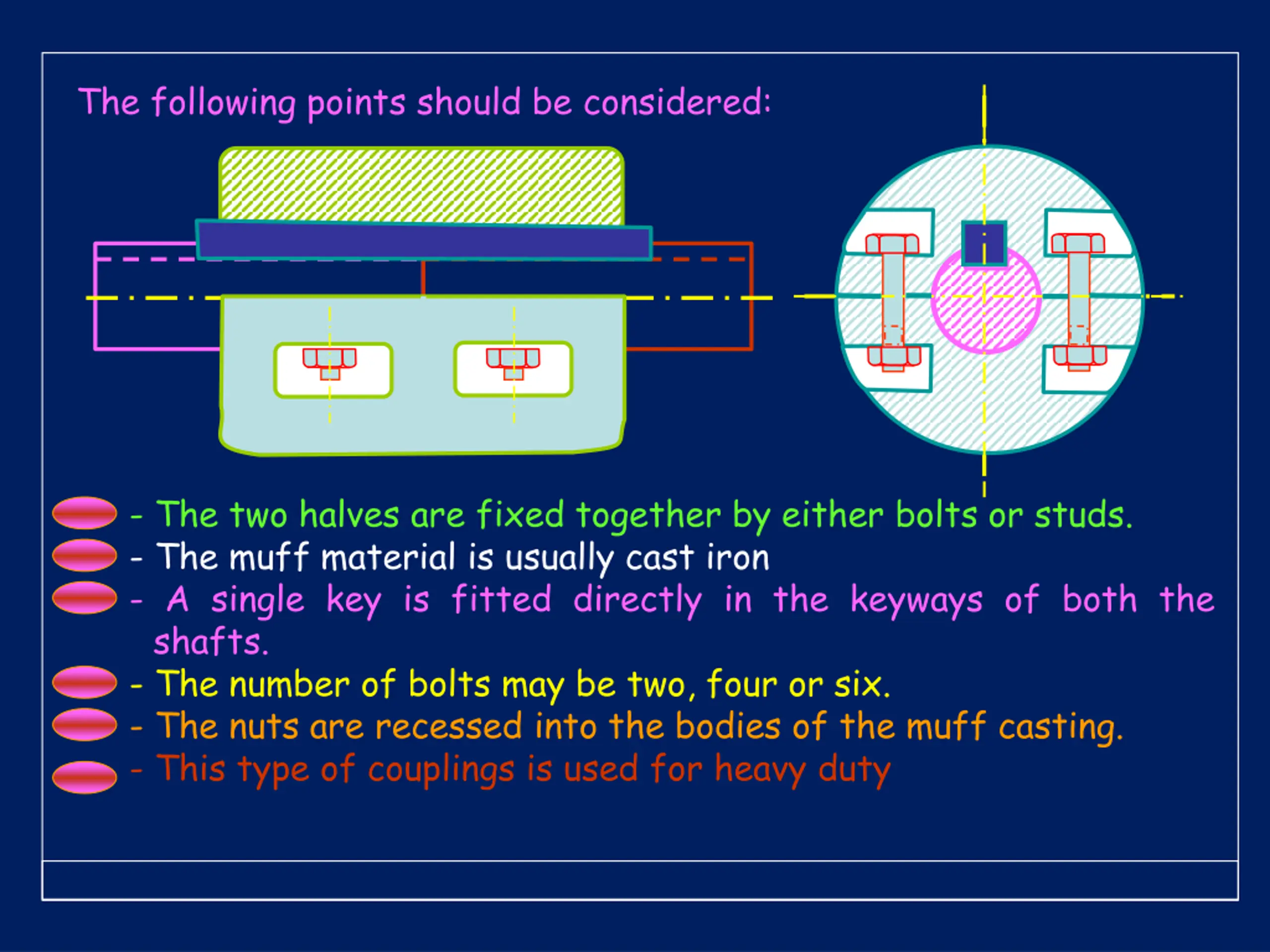 The following points should be considered: - The two halves are fixed together by either bolts or studs. - The muff material is usually cast iron - A single key is fitted directly in the keyways of both the shafts. - The number of bolts may be two, four or six. - The nuts are recessed into the bodies of the muff casting. - This type of couplings is used for heavy duty