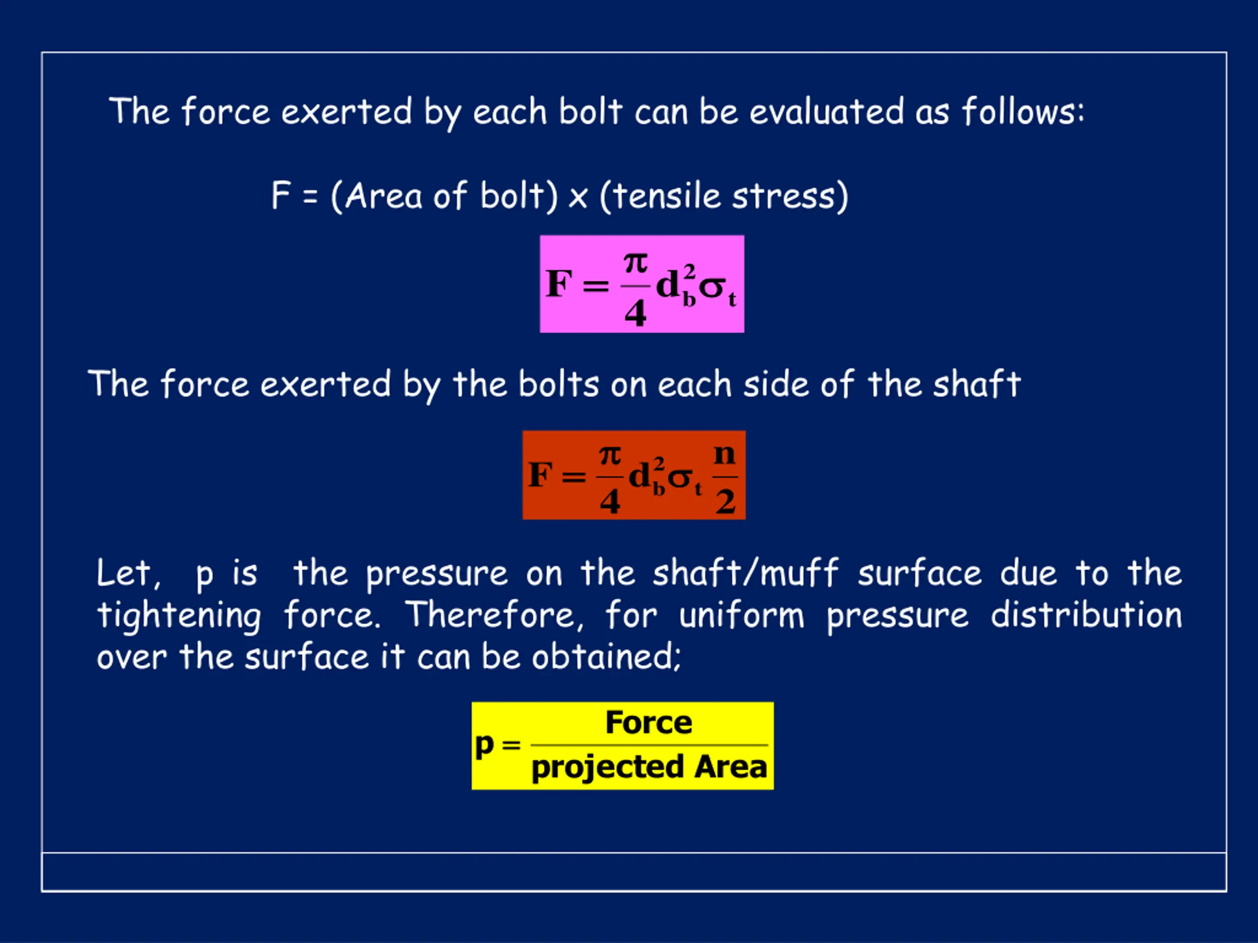 The force exerted by each bolt can be evaluated as follows: F = (Area of bolt) x (tensile stress) = = 2 b F d t 4 The force exerted by the bolts on each side of the shaft n = = 2 b F d t 4 2 Let, tightening force. Therefore, for uniform pressure distribution over the surface it can be obtained; p is the pressure on the shaft/muff surface due to the Force p = = projected Area