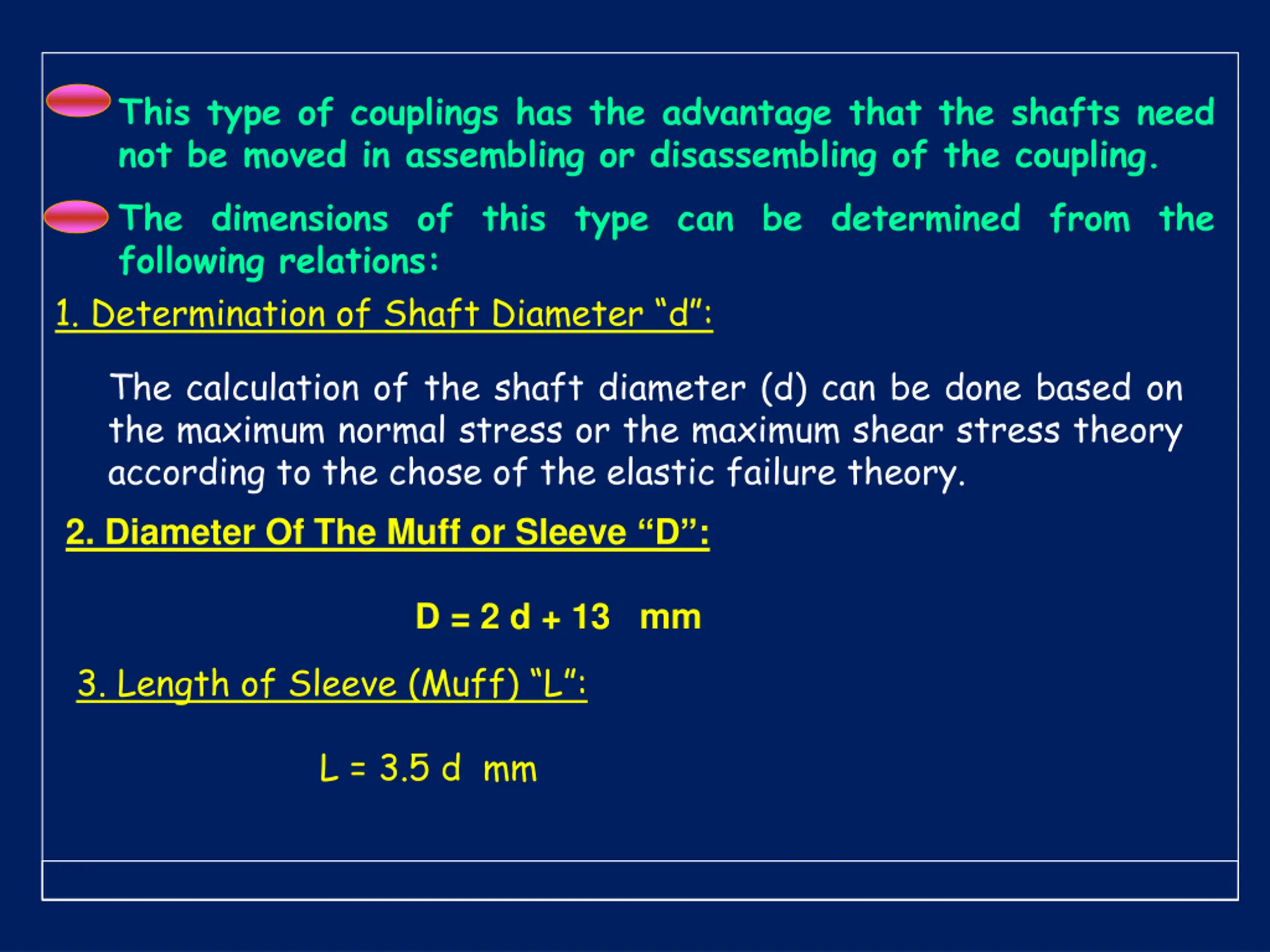 This type of couplings has the advantage that the shafts need not be moved in assembling or disassembling of the coupling. The dimensions of this type can be determined from the following relations: 1. Determination of Shaft Diameter d : The calculation of the shaft diameter (d) can be done based on the maximum normal stress or the maximum shear stress theory according to the chose of the elastic failure theory. 2. Diameter Of The Muff or Sleeve D : D = 2 d + 13 mm 3. Length of Sleeve (Muff) L : L = 3.5 d mm