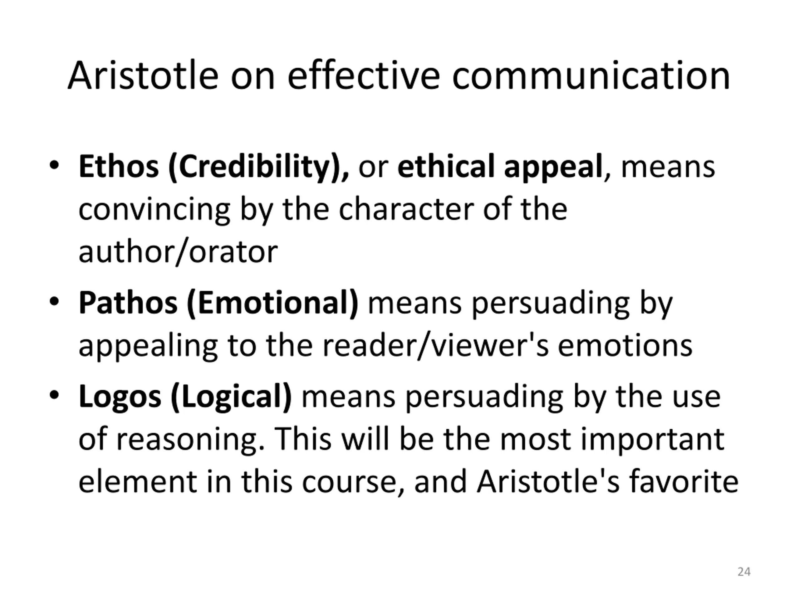 Aristotle on effective communication Ethos (Credibility), or ethical appeal, means convincing by the character of the author/orator Pathos (Emotional) means persuading by appealing to the reader/viewer's emotions Logos (Logical) means persuading by the use of reasoning. This will be the most important element in this course, and Aristotle's favorite 24