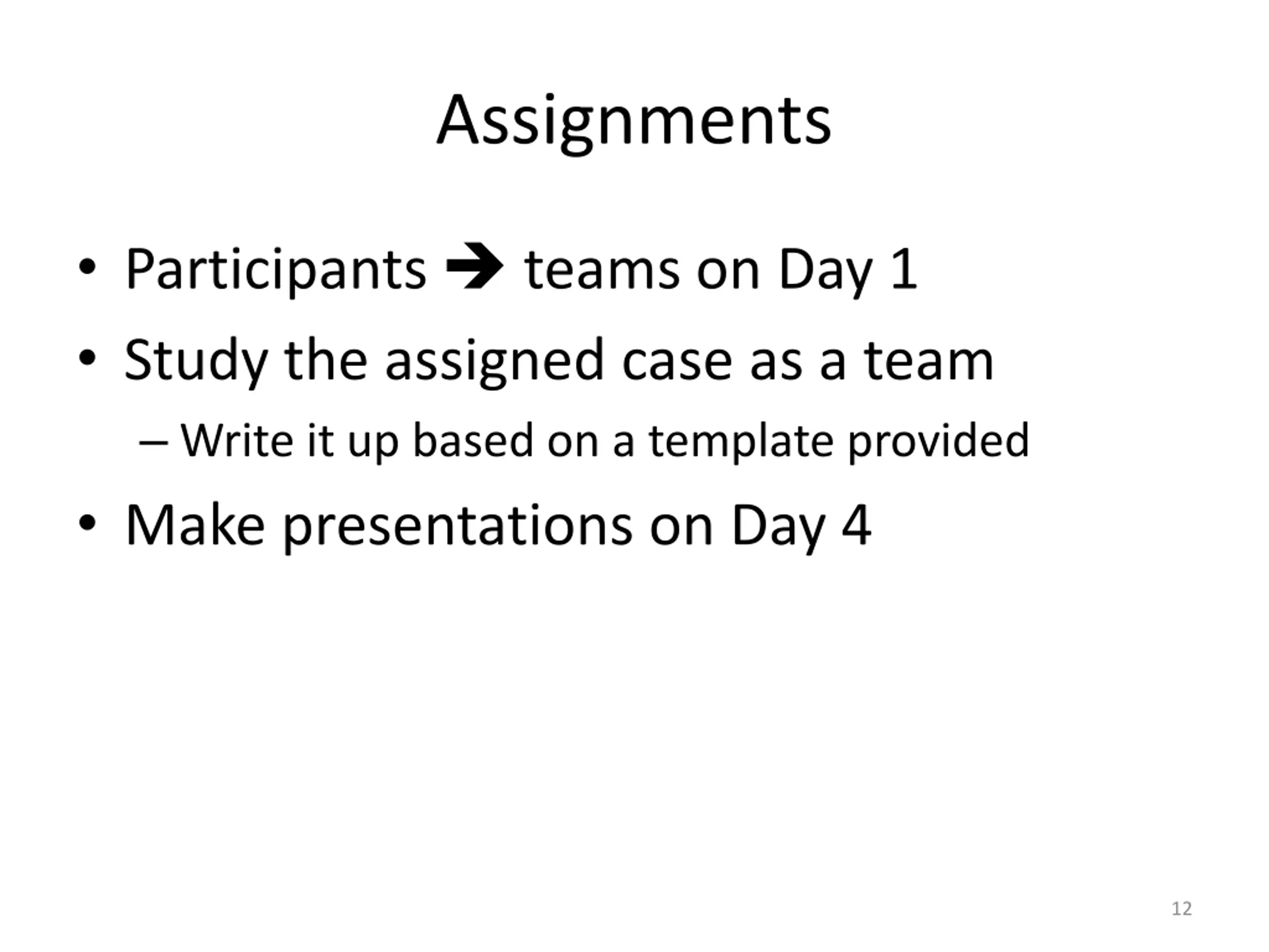 Assignments Participants teams on Day 1 Study the assigned case as a team Write it up based on a template provided Make presentations on Day 4 12