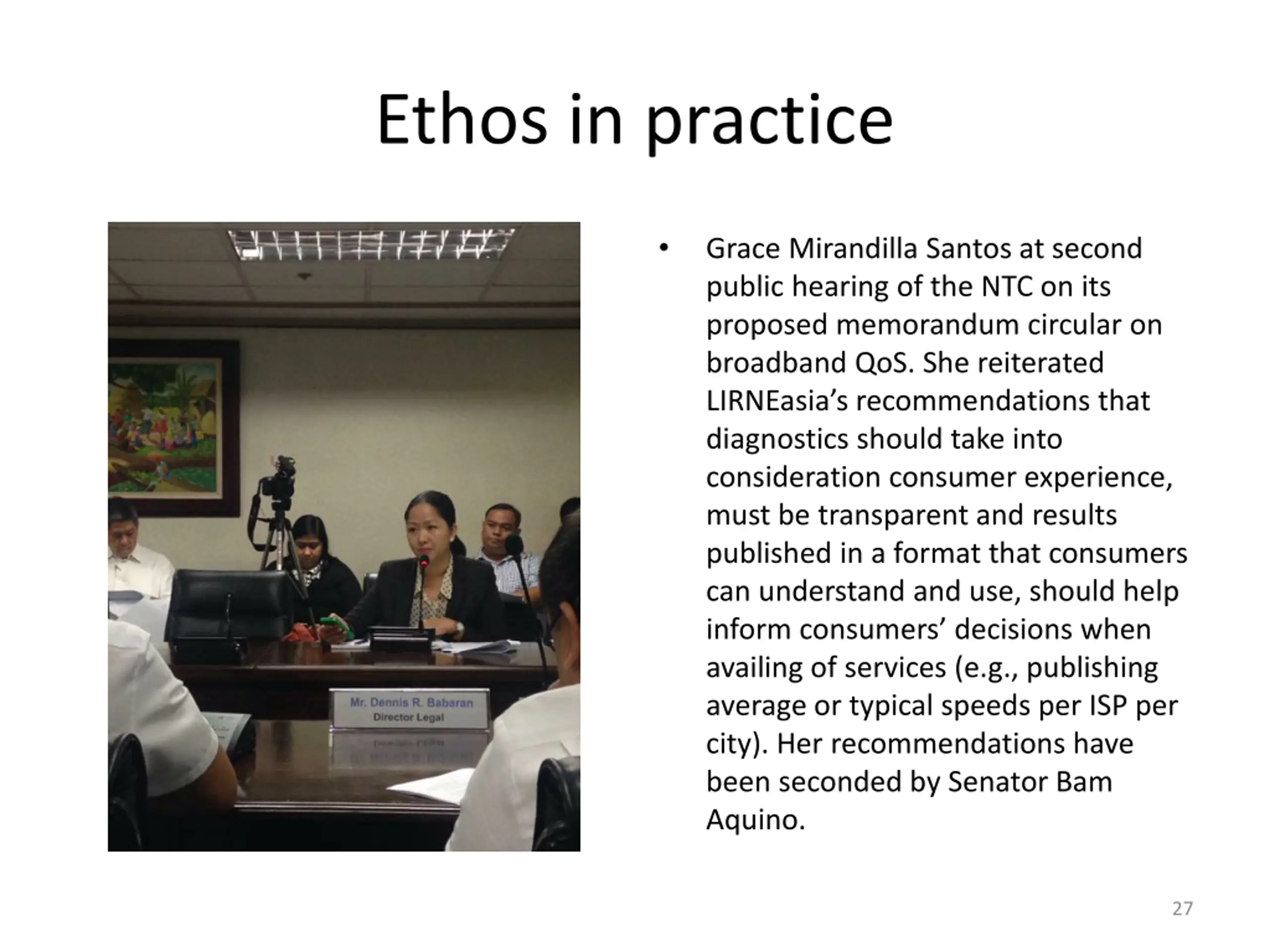 Ethos in practice Grace Mirandilla Santos at second public hearing of the NTC on its proposed memorandum circular on broadband QoS. She reiterated LIRNEasia s recommendations that diagnostics should take into consideration consumer experience, must be transparent and results published in a format that consumers can understand and use, should help inform consumers decisions when availing of services (e.g., publishing average or typical speeds per ISP per city). Her recommendations have been seconded by Senator Bam Aquino. 27