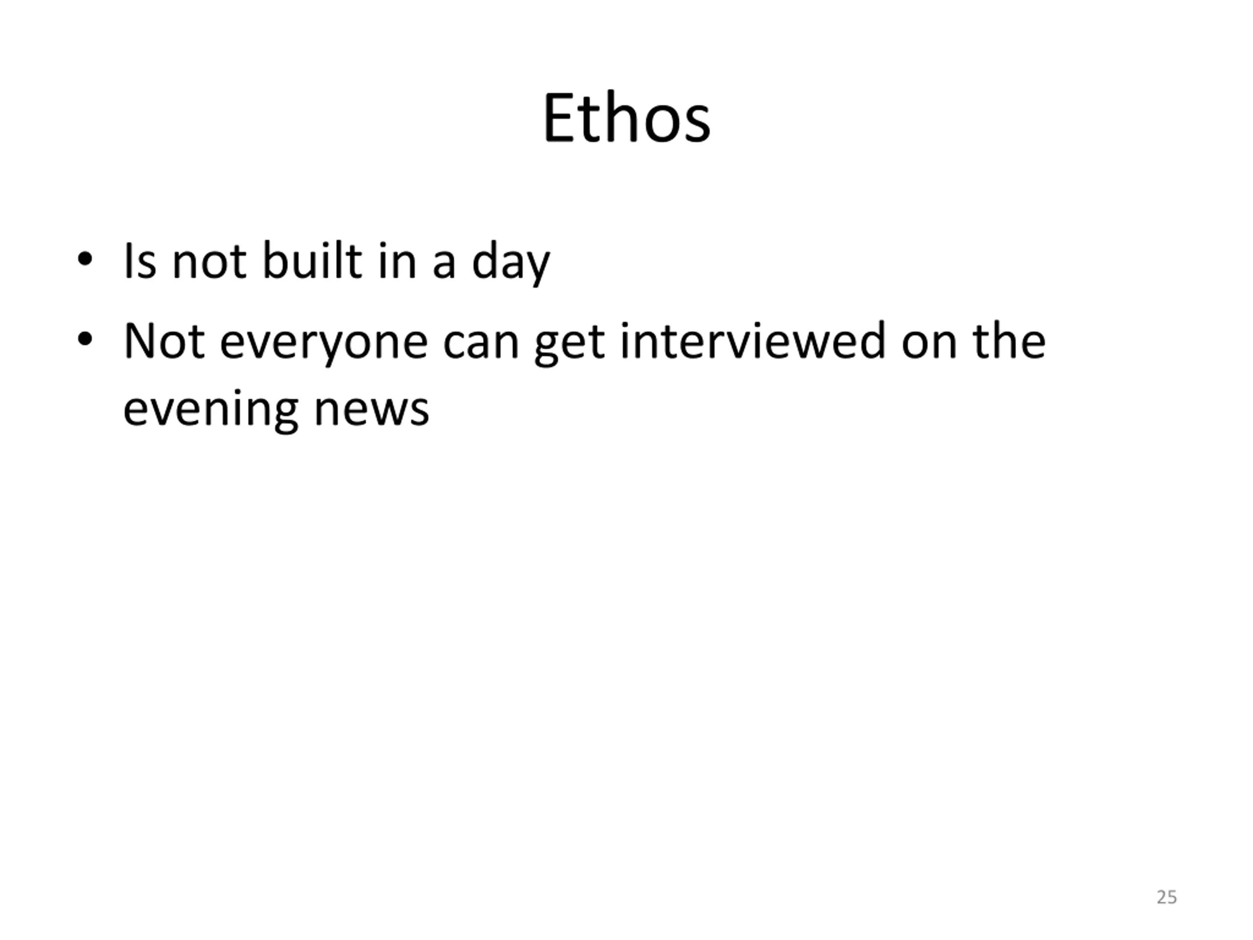 Ethos Is not built in a day Not everyone can get interviewed on the evening news 25