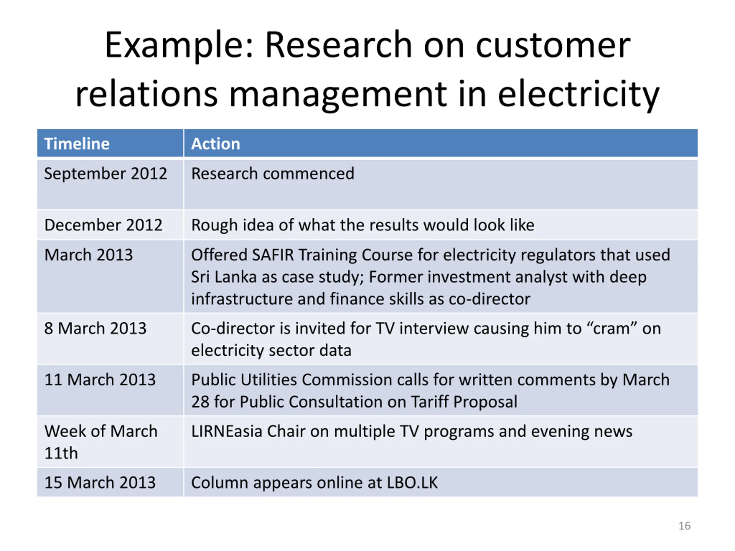 Example: Research on customer relations management in electricity Timeline Action September 2012 Research commenced December 2012 Rough idea of what the results would look like March 2013 Offered SAFIR Training Course for electricity regulators that used Sri Lanka as case study; Former investment analyst with deep infrastructure and finance skills as co-director 8 March 2013 Co-director is invited for TV interview causing him to cram on electricity sector data 11 March 2013 Public Utilities Commission calls for written comments by March 28 for Public Consultation on Tariff Proposal Week of March 11th LIRNEasia Chair on multiple TV programs and evening news 15 March 2013 Column appears online at LBO.LK 16