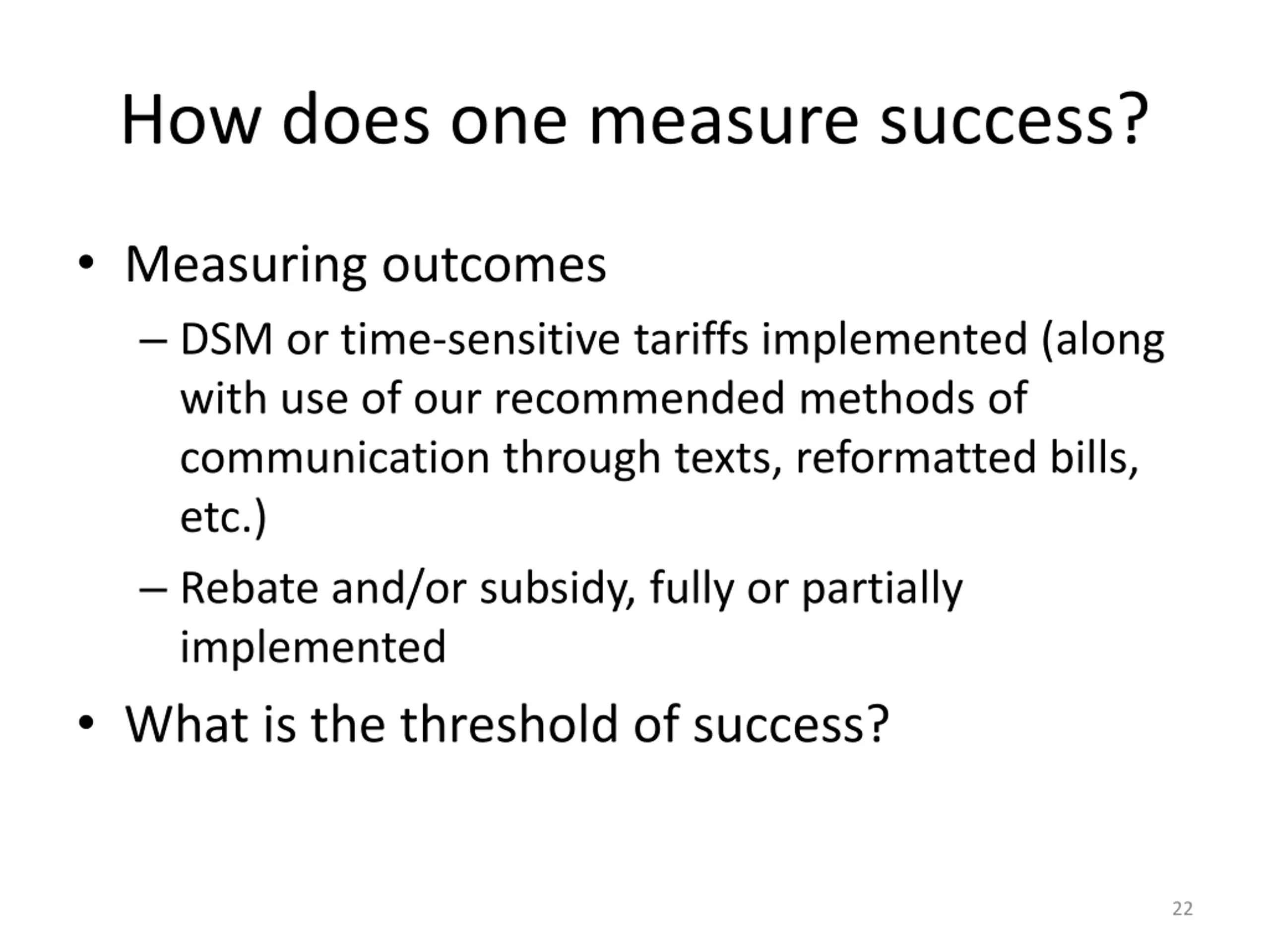 How does one measure success? Measuring outcomes DSM or time-sensitive tariffs implemented (along with use of our recommended methods of communication through texts, reformatted bills, etc.) Rebate and/or subsidy, fully or partially implemented What is the threshold of success? 22