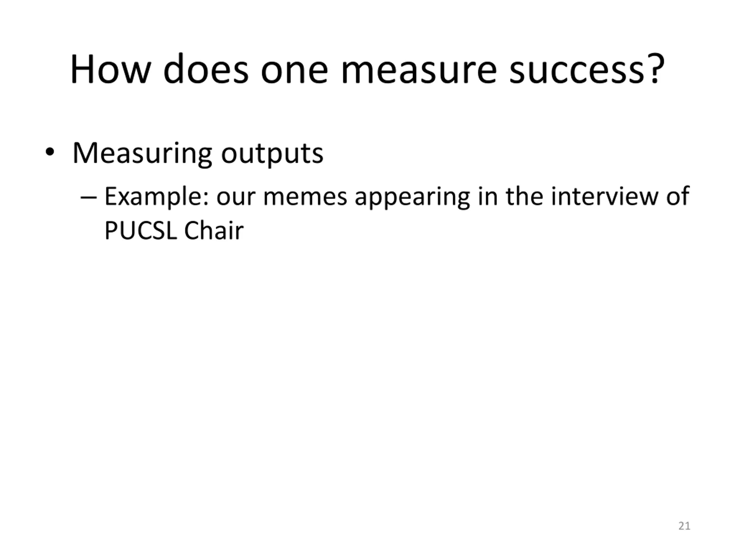 How does one measure success? Measuring outputs Example: our memes appearing in the interview of PUCSL Chair 21