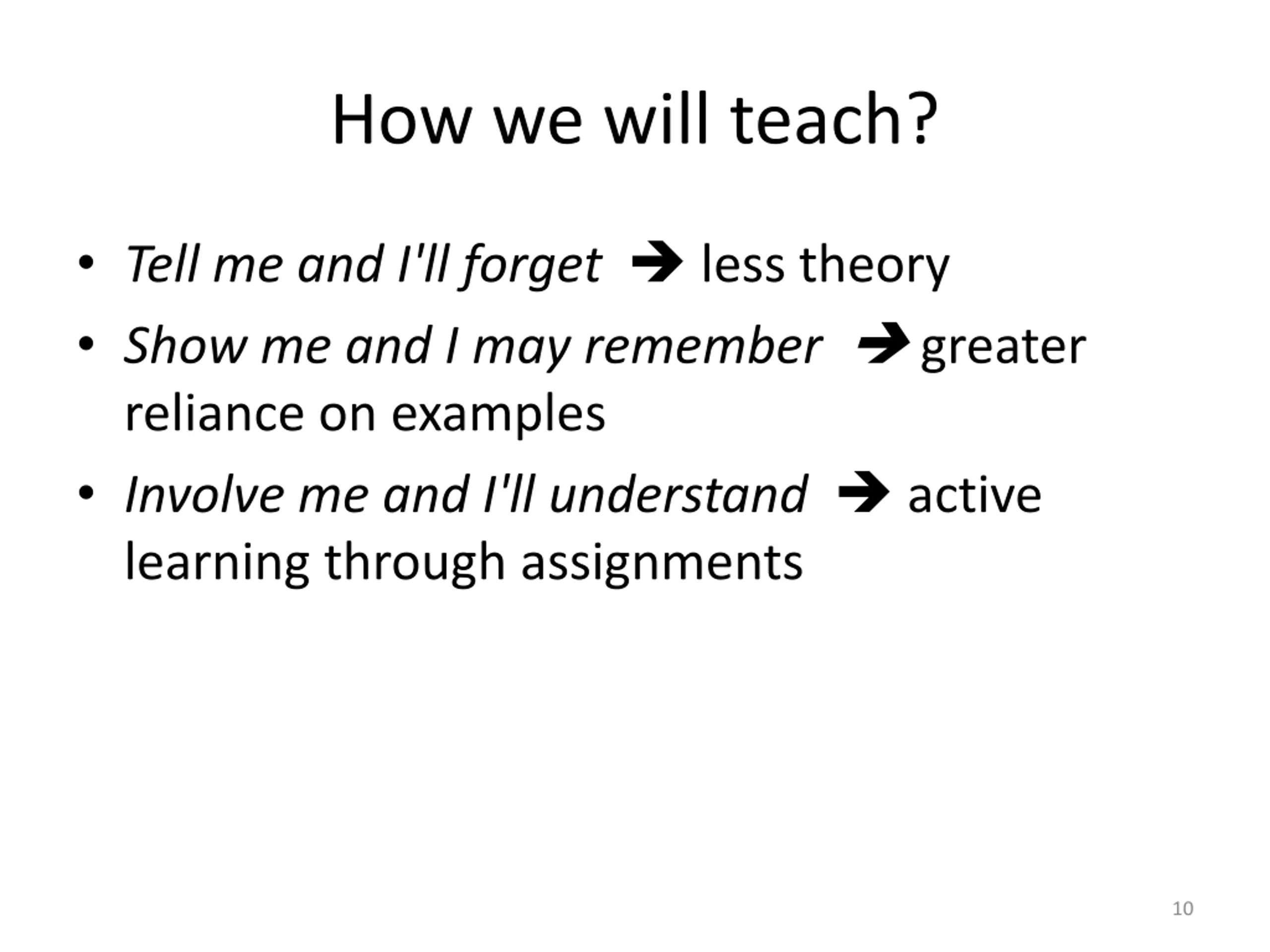 How we will teach? Tell me and I'll forget less theory Show me and I may remember greater reliance on examples Involve me and I'll understand active learning through assignments 10