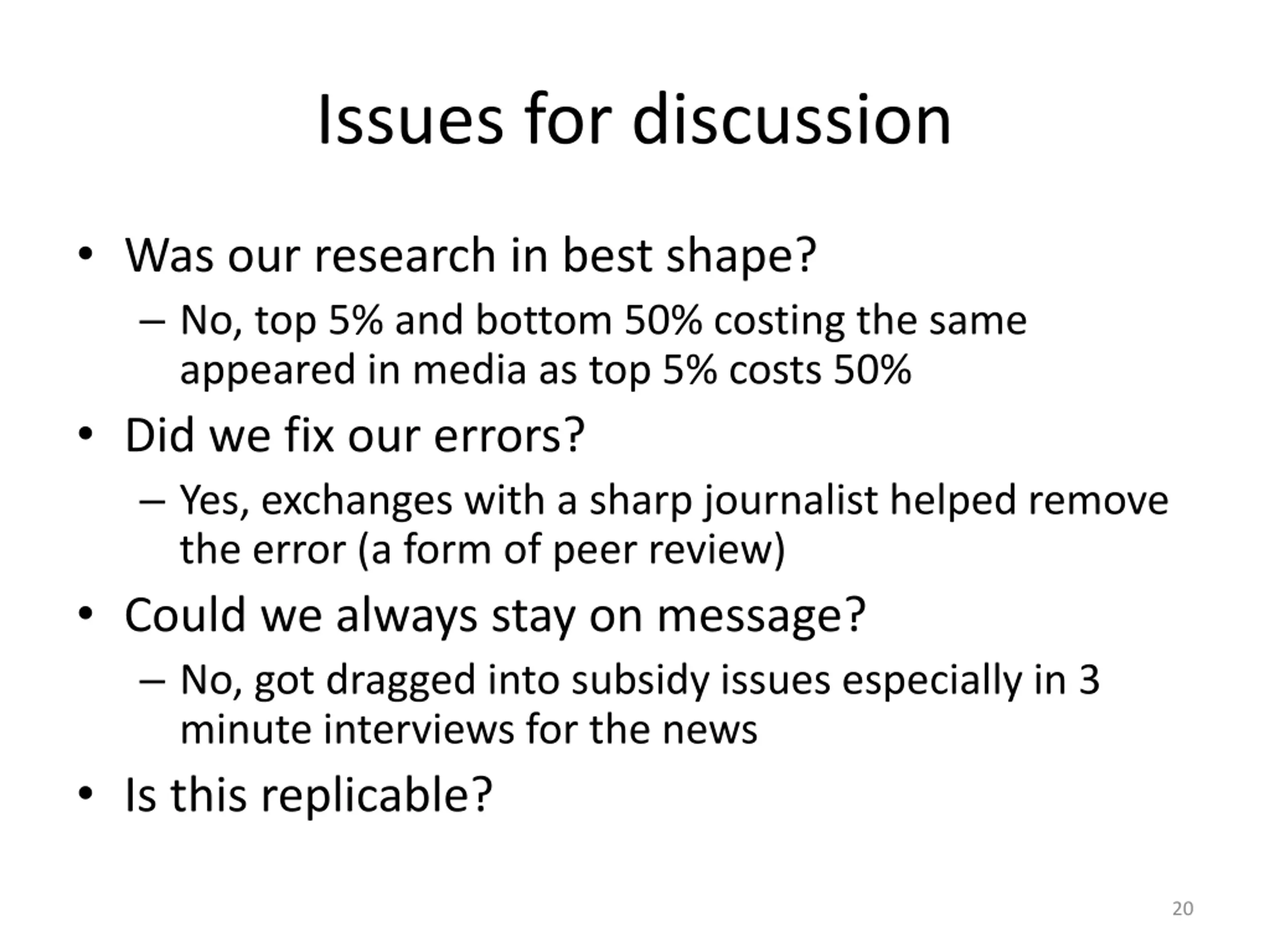 Issues for discussion Was our research in best shape? No, top 5% and bottom 50% costing the same appeared in media as top 5% costs 50% Did we fix our errors? Yes, exchanges with a sharp journalist helped remove the error (a form of peer review) Could we always stay on message? No, got dragged into subsidy issues especially in 3 minute interviews for the news Is this replicable? 20