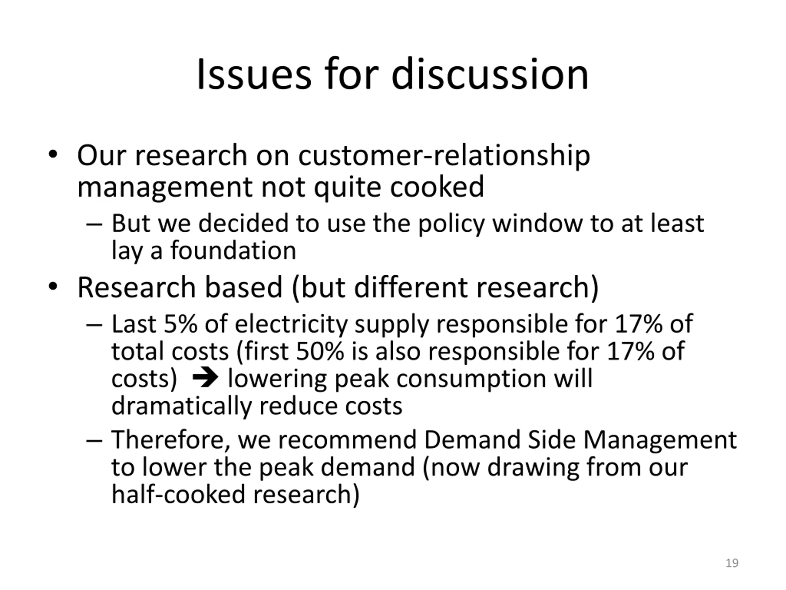 Issues for discussion Our research on customer-relationship management not quite cooked But we decided to use the policy window to at least lay a foundation Research based (but different research) Last 5% of electricity supply responsible for 17% of total costs (first 50% is also responsible for 17% of costs) lowering peak consumption will dramatically reduce costs Therefore, we recommend Demand Side Management to lower the peak demand (now drawing from our half-cooked research) 19