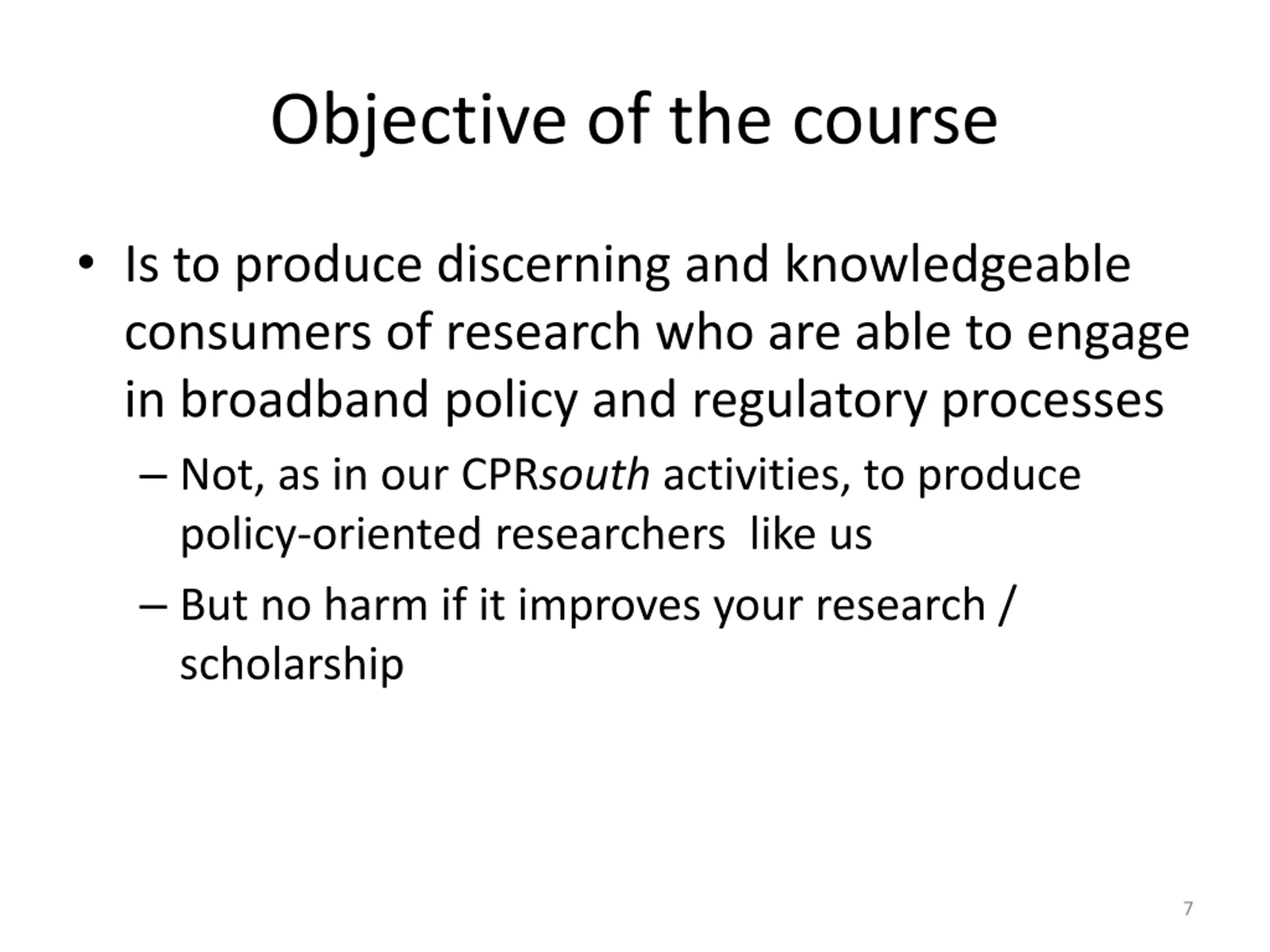 Objective of the course Is to produce discerning and knowledgeable consumers of research who are able to engage in broadband policy and regulatory processes Not, as in our CPRsouth activities, to produce policy-oriented researchers like us But no harm if it improves your research / scholarship 7