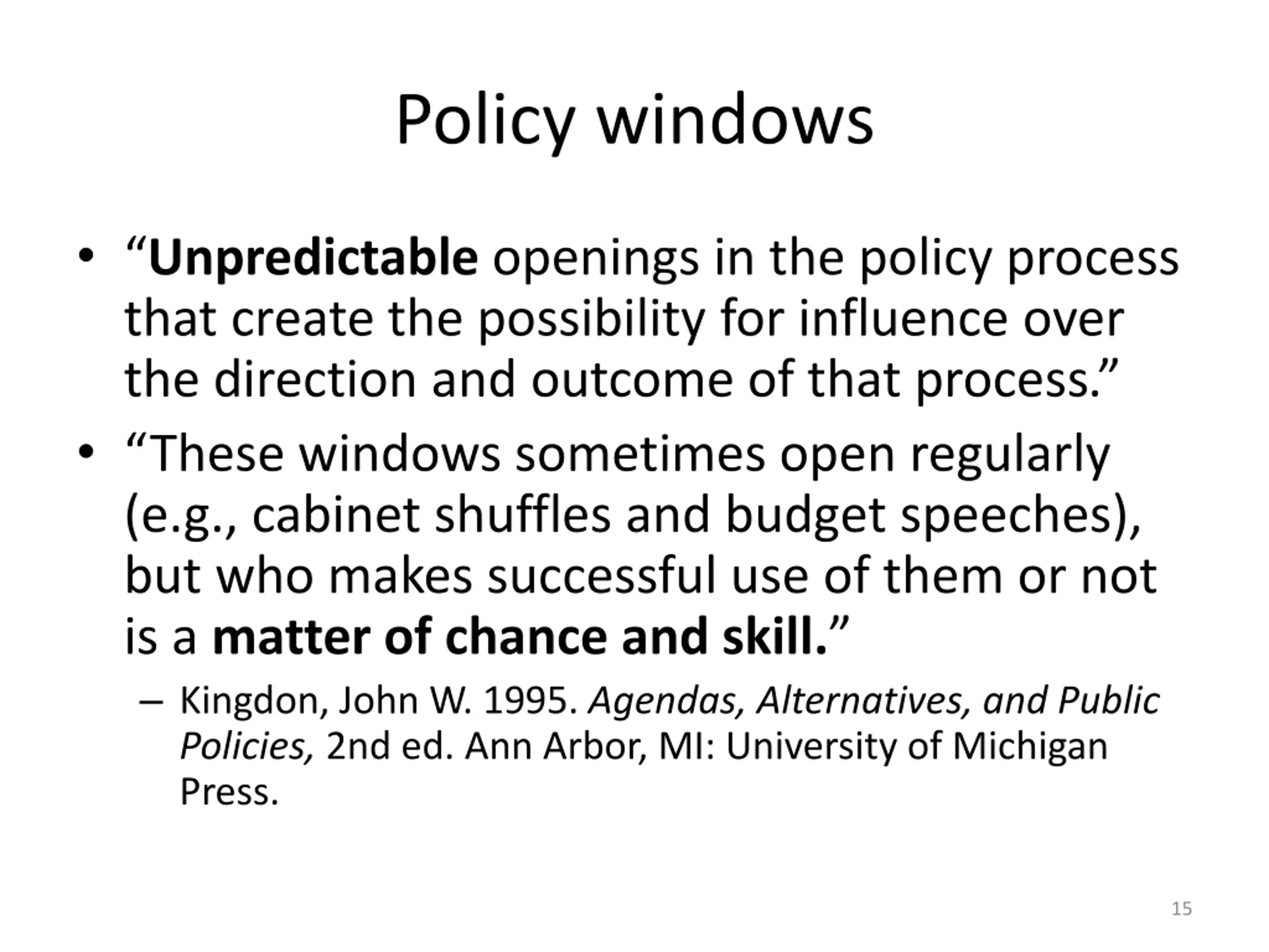 Policy windows Unpredictable openings in the policy process that create the possibility for influence over the direction and outcome of that process. These windows sometimes open regularly (e.g., cabinet shuffles and budget speeches), but who makes successful use of them or not is a matter of chance and skill. Kingdon, John W. 1995. Agendas, Alternatives, and Public Policies, 2nd ed. Ann Arbor, MI: University of Michigan Press. 15