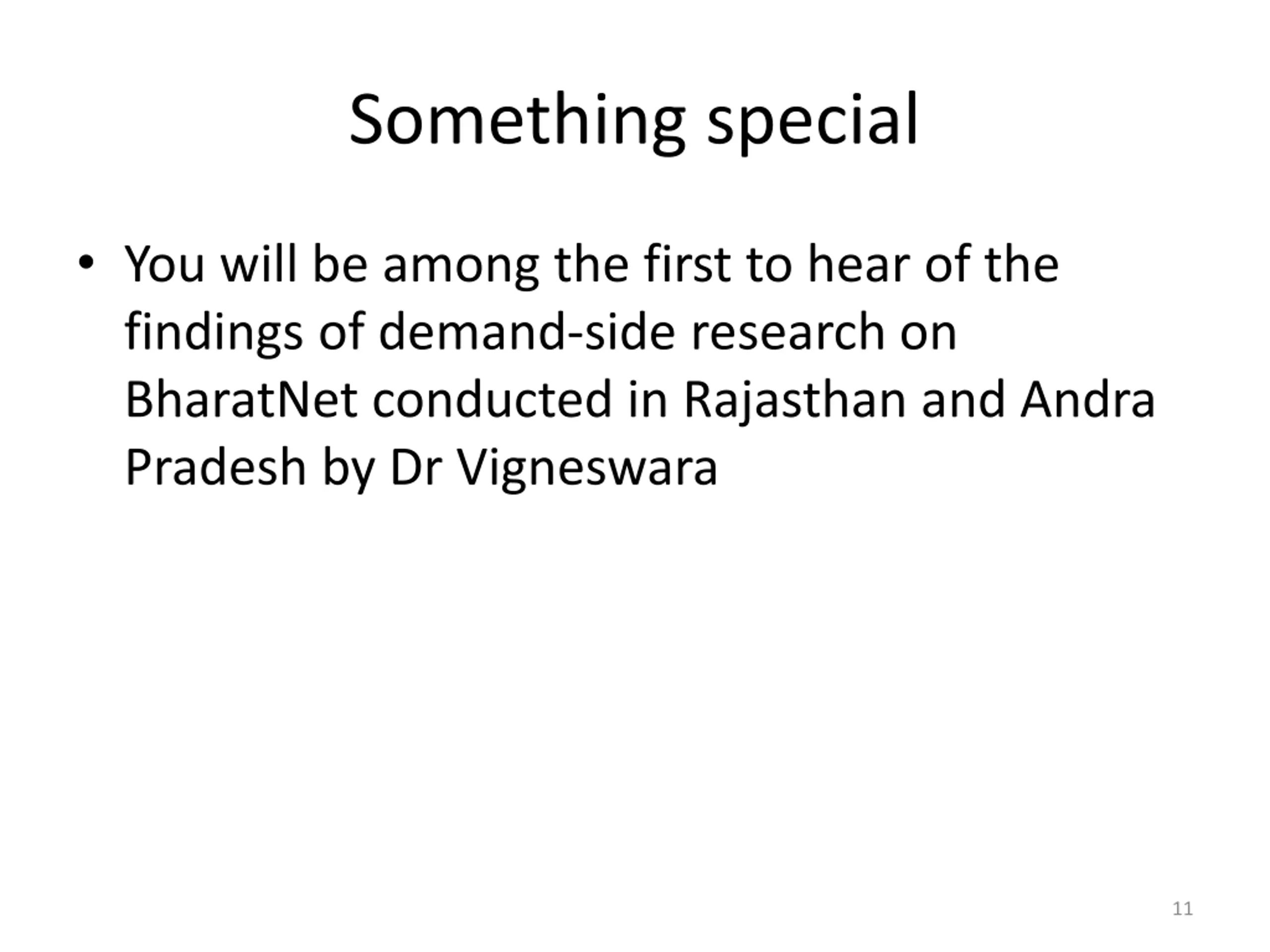 Something special You will be among the first to hear of the findings of demand-side research on BharatNet conducted in Rajasthan and Andra Pradesh by Dr Vigneswara 11