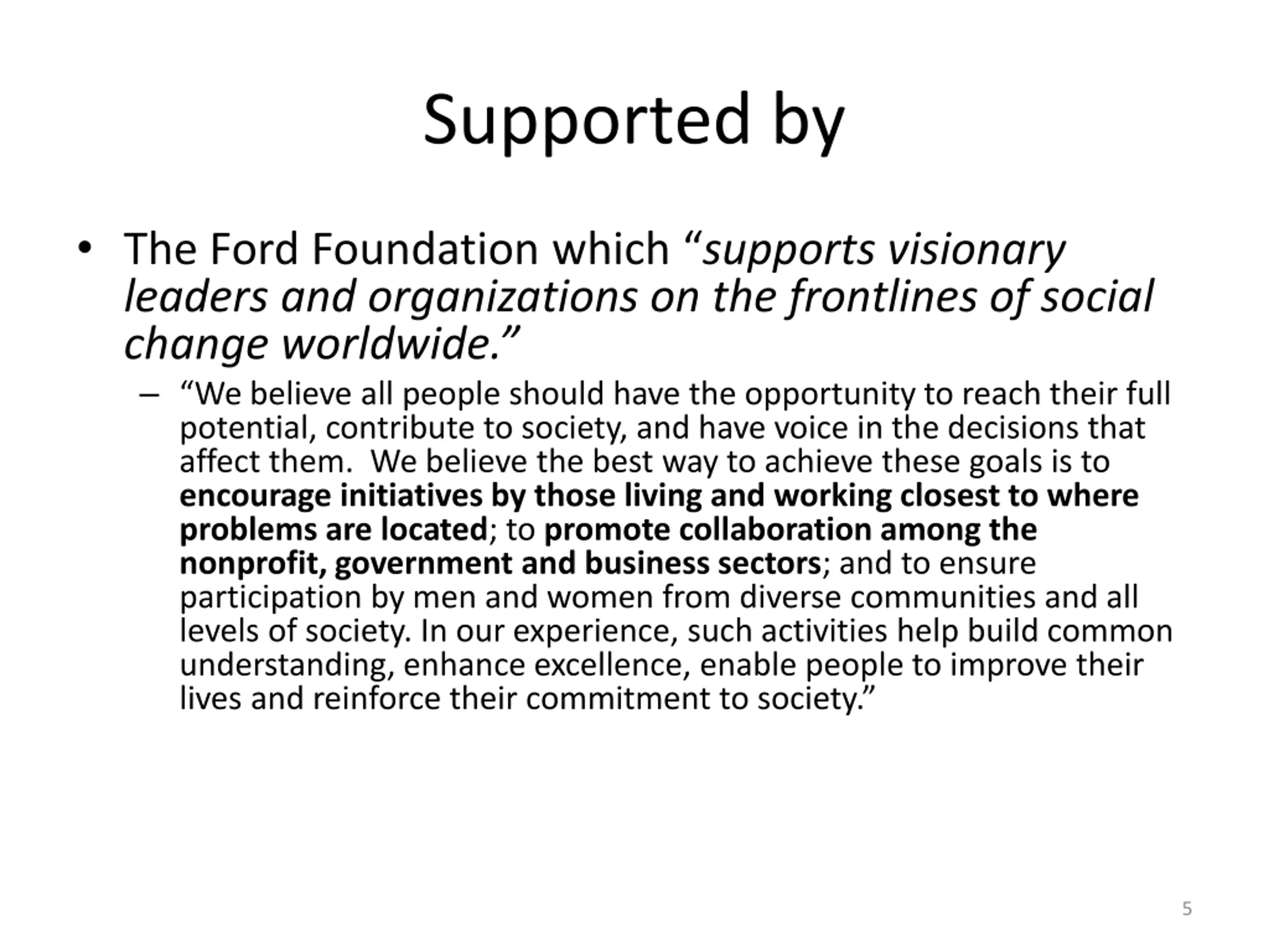 Supported by The Ford Foundation which supports visionary leaders and organizations on the frontlines of social change worldwide. We believe all people should have the opportunity to reach their full potential, contribute to society, and have voice in the decisions that affect them. We believe the best way to achieve these goals is to encourage initiatives by those living and working closest to where problems are located; to promote collaboration among the nonprofit, government and business sectors; and to ensure participation by men and women from diverse communities and all levels of society. In our experience, such activities help build common understanding, enhance excellence, enable people to improve their lives and reinforce their commitment to society. 5