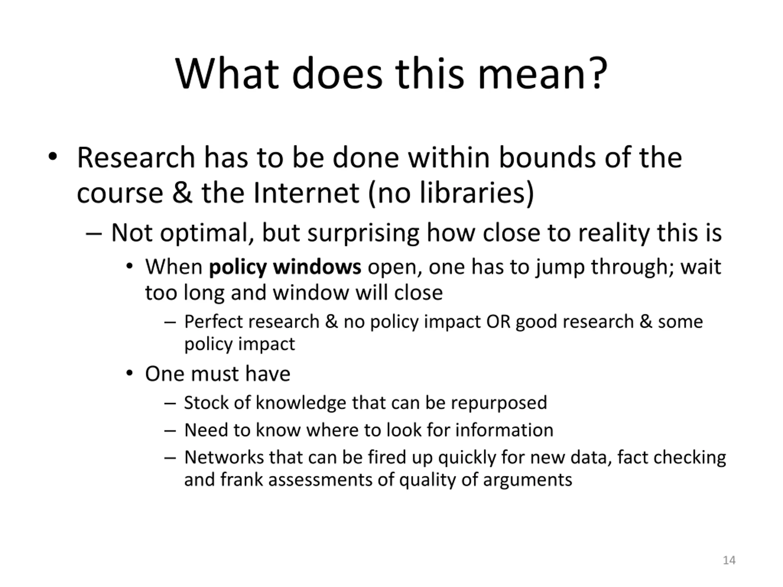 What does this mean? Research has to be done within bounds of the course & the Internet (no libraries) Not optimal, but surprising how close to reality this is When policy windows open, one has to jump through; wait too long and window will close Perfect research & no policy impact OR good research & some policy impact One must have Stock of knowledge that can be repurposed Need to know where to look for information Networks that can be fired up quickly for new data, fact checking and frank assessments of quality of arguments 14