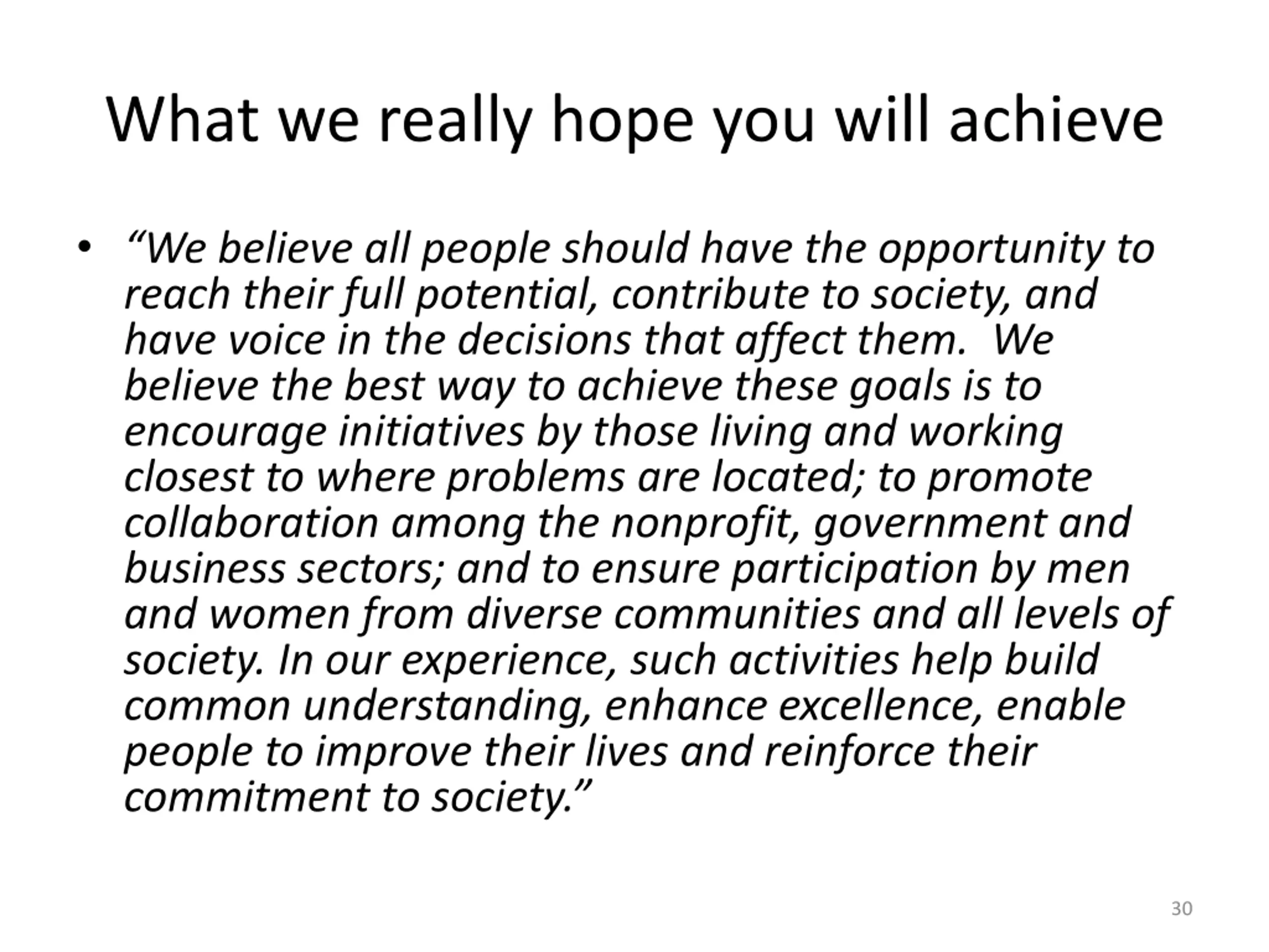 What we really hope you will achieve We believe all people should have the opportunity to reach their full potential, contribute to society, and have voice in the decisions that affect them. We believe the best way to achieve these goals is to encourage initiatives by those living and working closest to where problems are located; to promote collaboration among the nonprofit, government and business sectors; and to ensure participation by men and women from diverse communities and all levels of society. In our experience, such activities help build common understanding, enhance excellence, enable people to improve their lives and reinforce their commitment to society. 30