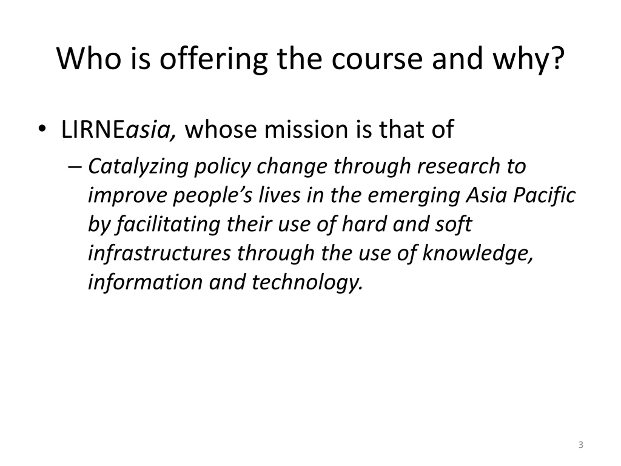 Who is offering the course and why? LIRNEasia, whose mission is that of Catalyzing policy change through research to improve people s lives in the emerging Asia Pacific by facilitating their use of hard and soft infrastructures through the use of knowledge, information and technology. 3