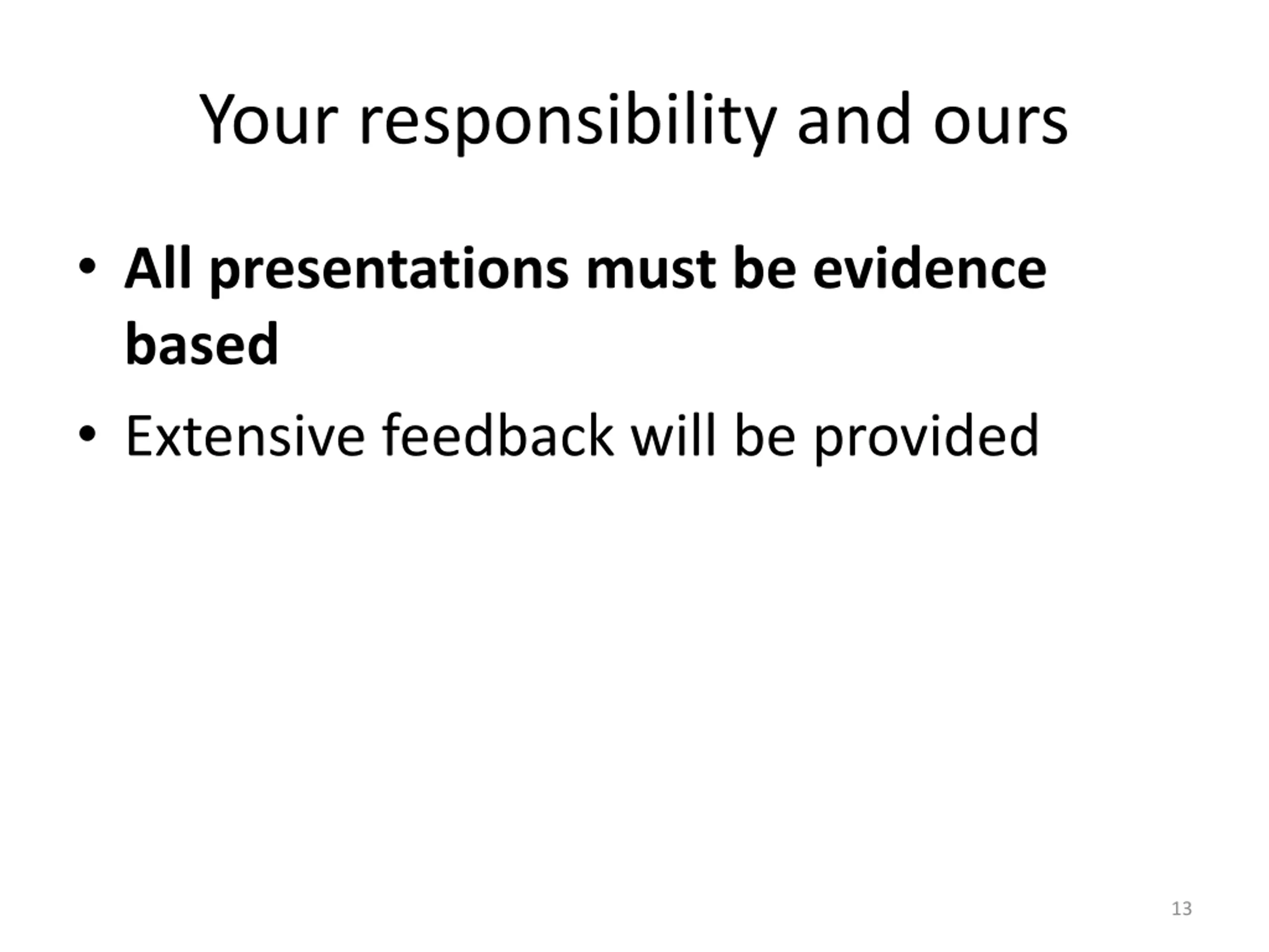 Your responsibility and ours All presentations must be evidence based Extensive feedback will be provided 13