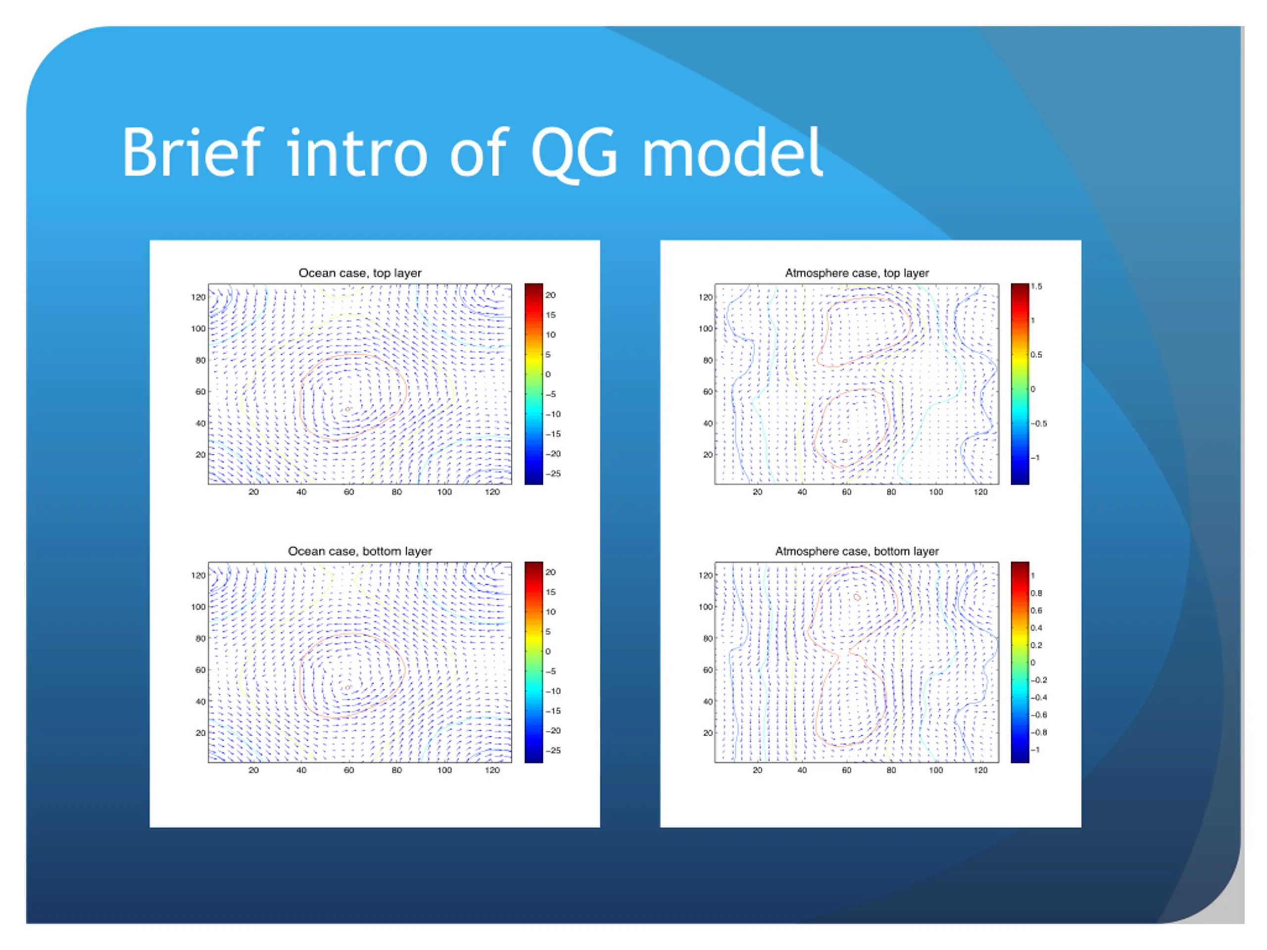 Brief intro of QG model 2D periodic domain with 128 128 2 grid points; 2 vertical layers; Prognostic variables: potential vorticity(q); Diagnostic variables: (u,v) and stream function( ). dU) y1 q1 t +J(y1,q1)+U q1 x+(b +k2 +n 8q1=0 Top layer : x dU) y2 q2 t +J(y2,q2)-U q2 +(b -k2 +k 2y2+n 8q2=0 Bottom layer : x x Atmosphere case and ocean case