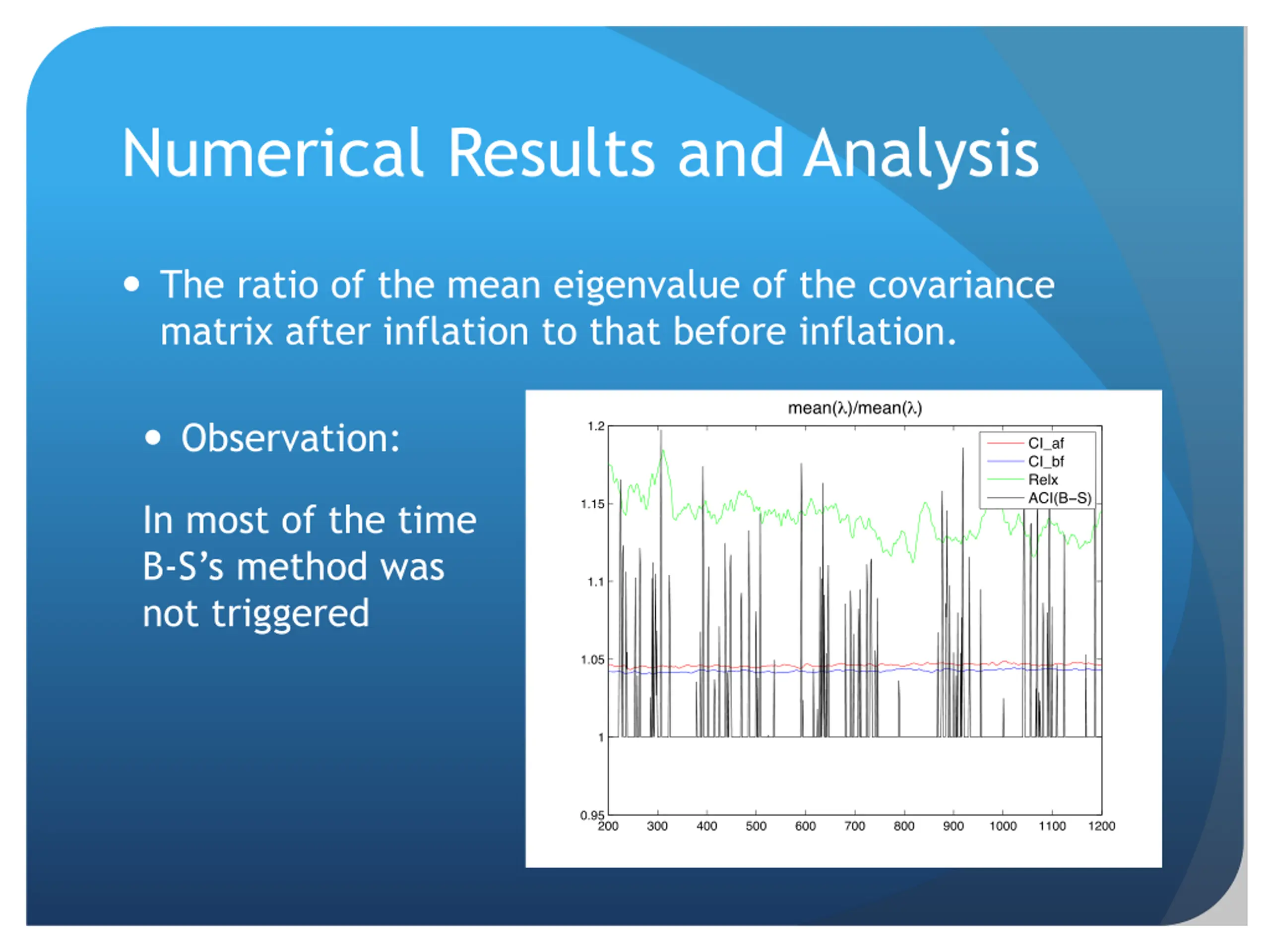 Numerical Results and Analysis The ratio of the mean eigenvalue of the covariance matrix after inflation to that before inflation. Observation: In most of the time B-S s method was not triggered