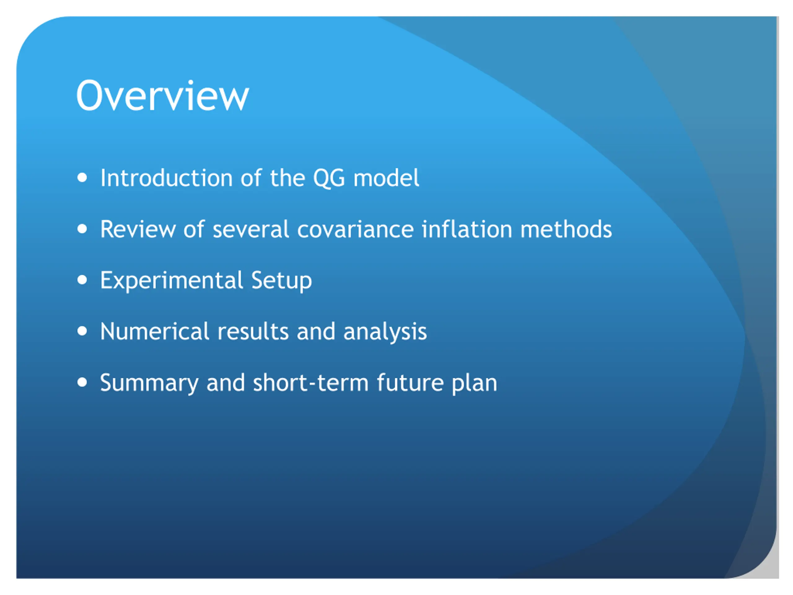 Overview Introduction of the QG model Review of several covariance inflation methods Experimental Setup Numerical results and analysis Summary and short-term future plan