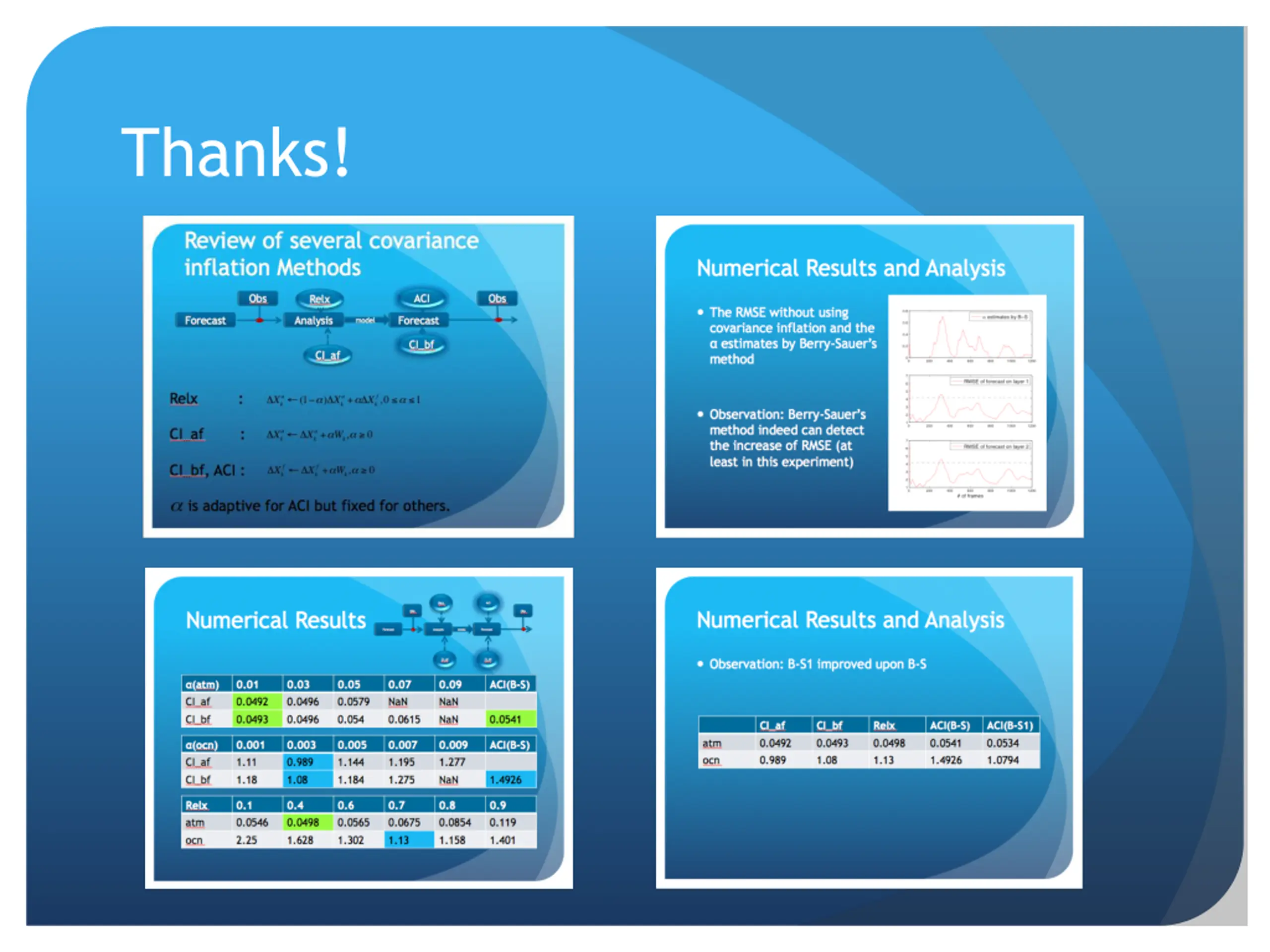 Numerical Results and Analysis Observation: Berry-Sauer s method improved RMSE but the result is not optimal. CI_af 0.0492 0.989 CI_bf 0.0493 1.08 Relx 0.0498 1.13 ACI(B-S) 0.0541 1.4926 atm ocn