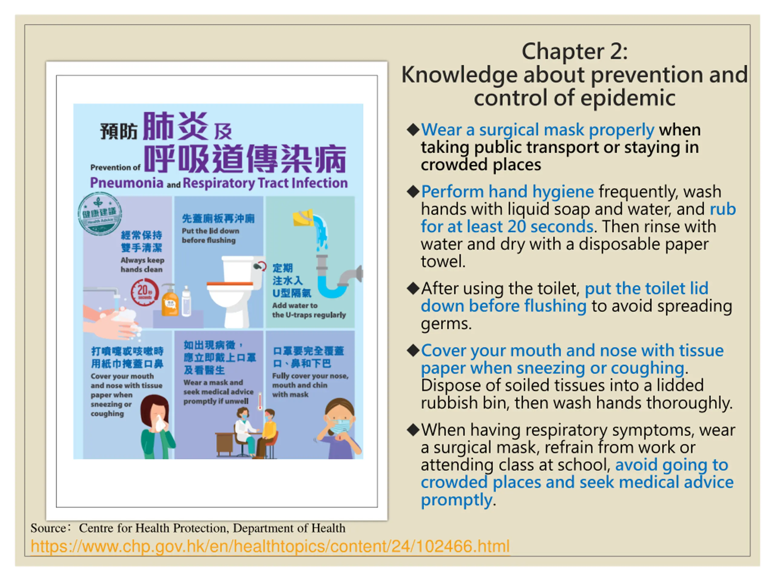 Chapter 2: Knowledge about prevention and control of epidemic Wear a surgical mask properly when taking public transport or staying in crowded places Perform hand hygiene frequently, wash hands with liquid soap and water, and rub for at least 20 seconds. Then rinse with water and dry with a disposable paper towel. After using the toilet, put the toilet lid down before flushing to avoid spreading germs. Cover your mouth and nose with tissue paper when sneezing or coughing. Dispose of soiled tissues into a lidded rubbish bin, then wash hands thoroughly. When having respiratory symptoms, wear a surgical mask, refrain from work or attending class at school, avoid going to crowded places and seek medical advice promptly. Source Centre for Health Protection, Department of Health https://www.chp.gov.hk/en/healthtopics/content/24/102466.html