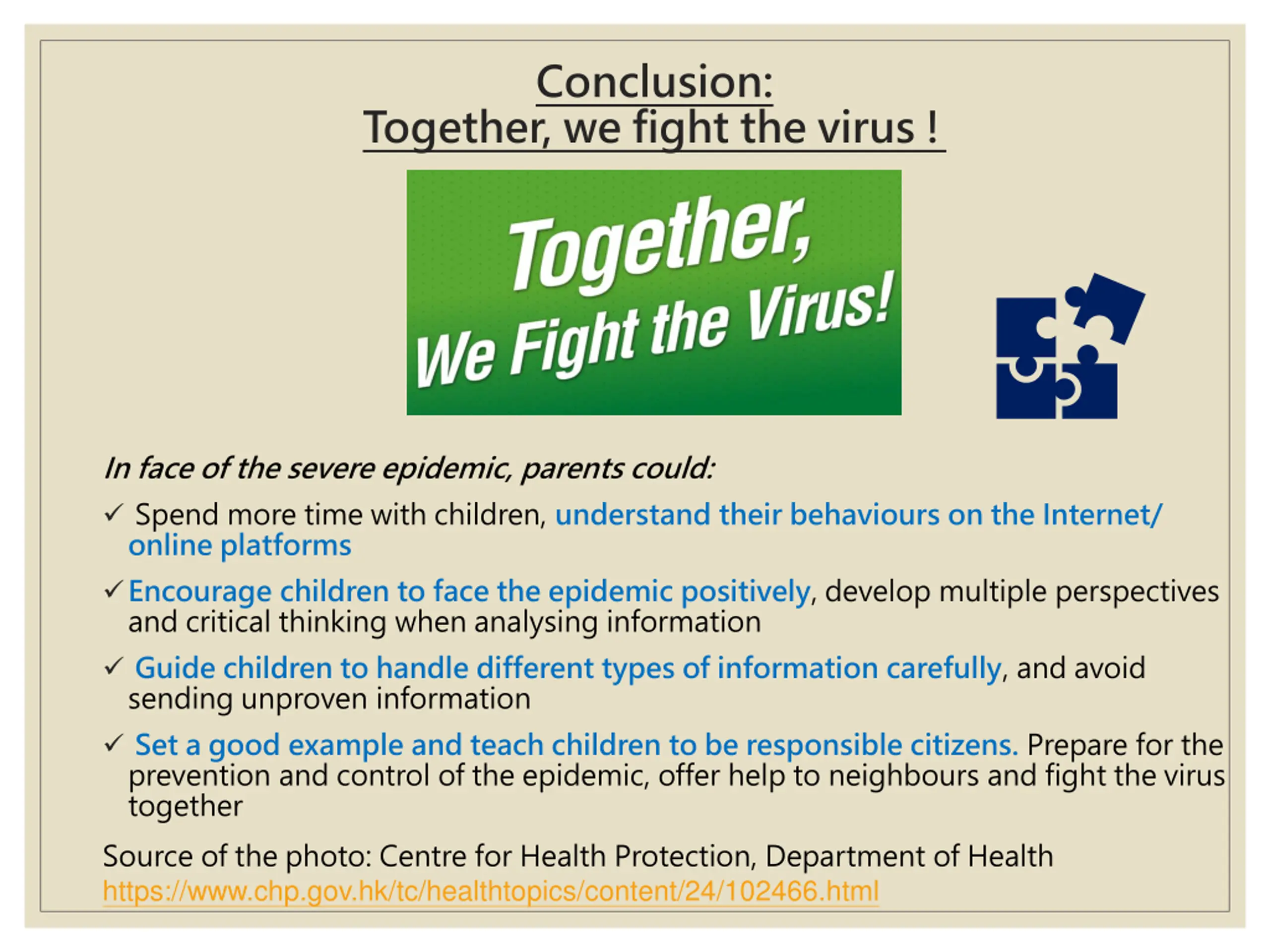 Conclusion: Together, we fight the virus ! In face of the severe epidemic, parents could: Spend more time with children, understand their behaviours on the Internet/ online platforms Encourage children to face the epidemic positively, develop multiple perspectives and critical thinking when analysing information Guide children to handle different types of information carefully, and avoid sending unproven information Set a good example and teach children to be responsible citizens. Prepare for the prevention and control of the epidemic, offer help to neighbours and fight the virus together Source of the photo: Centre for Health Protection, Department of Health https://www.chp.gov.hk/tc/healthtopics/content/24/102466.html