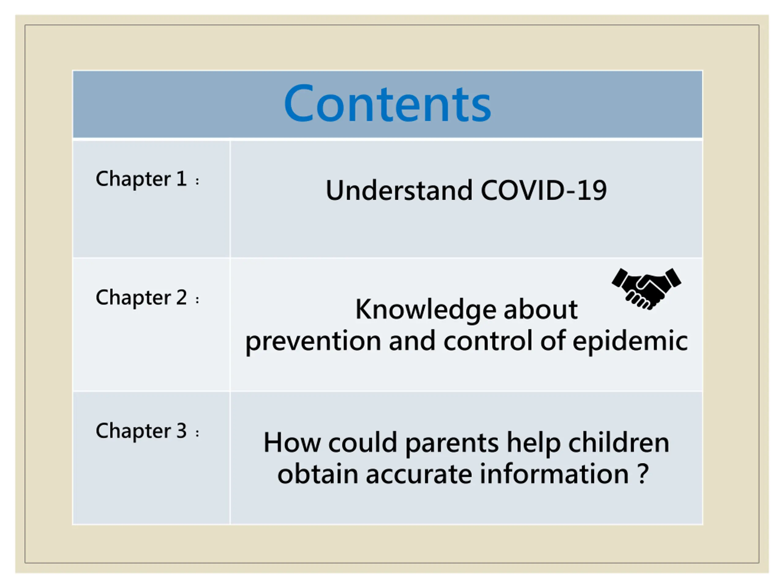 Contents Chapter 1 Understand COVID-19 Chapter 2 Knowledge about prevention and control of epidemic Chapter 3 How could parents help children obtain accurate information