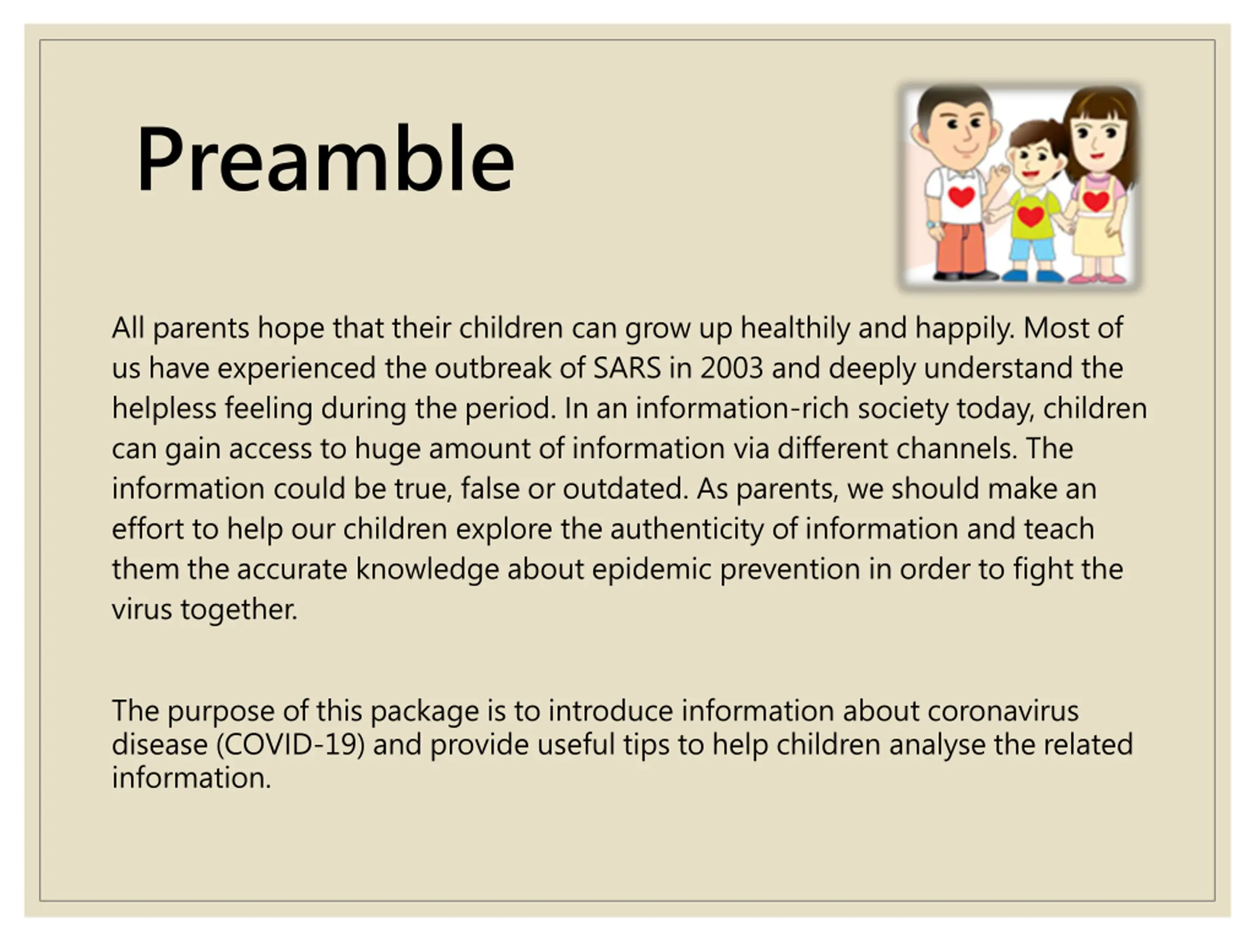 Preamble All parents hope that their children can grow up healthily and happily. Most of us have experienced the outbreak of SARS in 2003 and deeply understand the helpless feeling during the period. In an information-rich society today, children can gain access to huge amount of information via different channels. The information could be true, false or outdated. As parents, we should make an effort to help our children explore the authenticity of information and teach them the accurate knowledge about epidemic prevention in order to fight the virus together. The purpose of this package is to introduce information about coronavirus disease (COVID-19) and provide useful tips to help children analyse the related information.