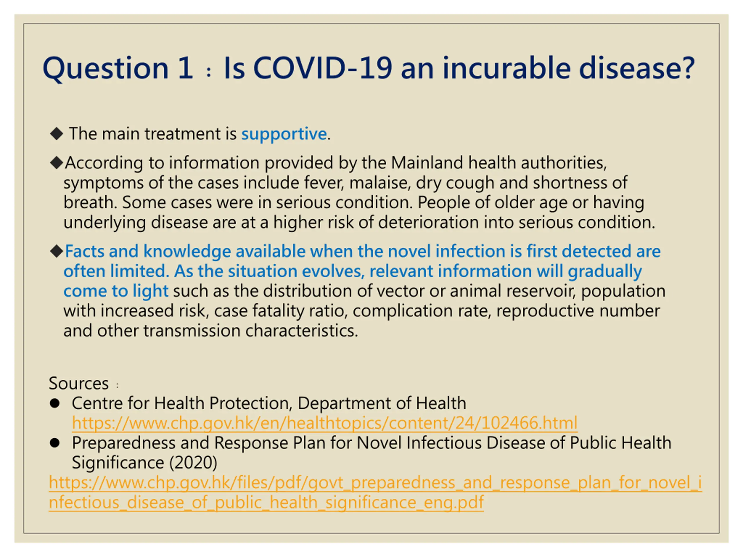 Question 1Is COVID-19 an incurable disease? The main treatment is supportive. According to information provided by the Mainland health authorities, symptoms of the cases include fever, malaise, dry cough and shortness of breath. Some cases were in serious condition. People of older age or having underlying disease are at a higher risk of deterioration into serious condition. Facts and knowledge available when the novel infection is first detected are often limited. As the situation evolves, relevant information will gradually come to light such as the distribution of vector or animal reservoir, population with increased risk, case fatality ratio, complication rate, reproductive number and other transmission characteristics. Sources Centre for Health Protection, Department of Health https://www.chp.gov.hk/en/healthtopics/content/24/102466.html Preparedness and Response Plan for Novel Infectious Disease of Public Health Significance (2020) https://www.chp.gov.hk/files/pdf/govt_preparedness_and_response_plan_for_novel_i nfectious_disease_of_public_health_significance_eng.pdf