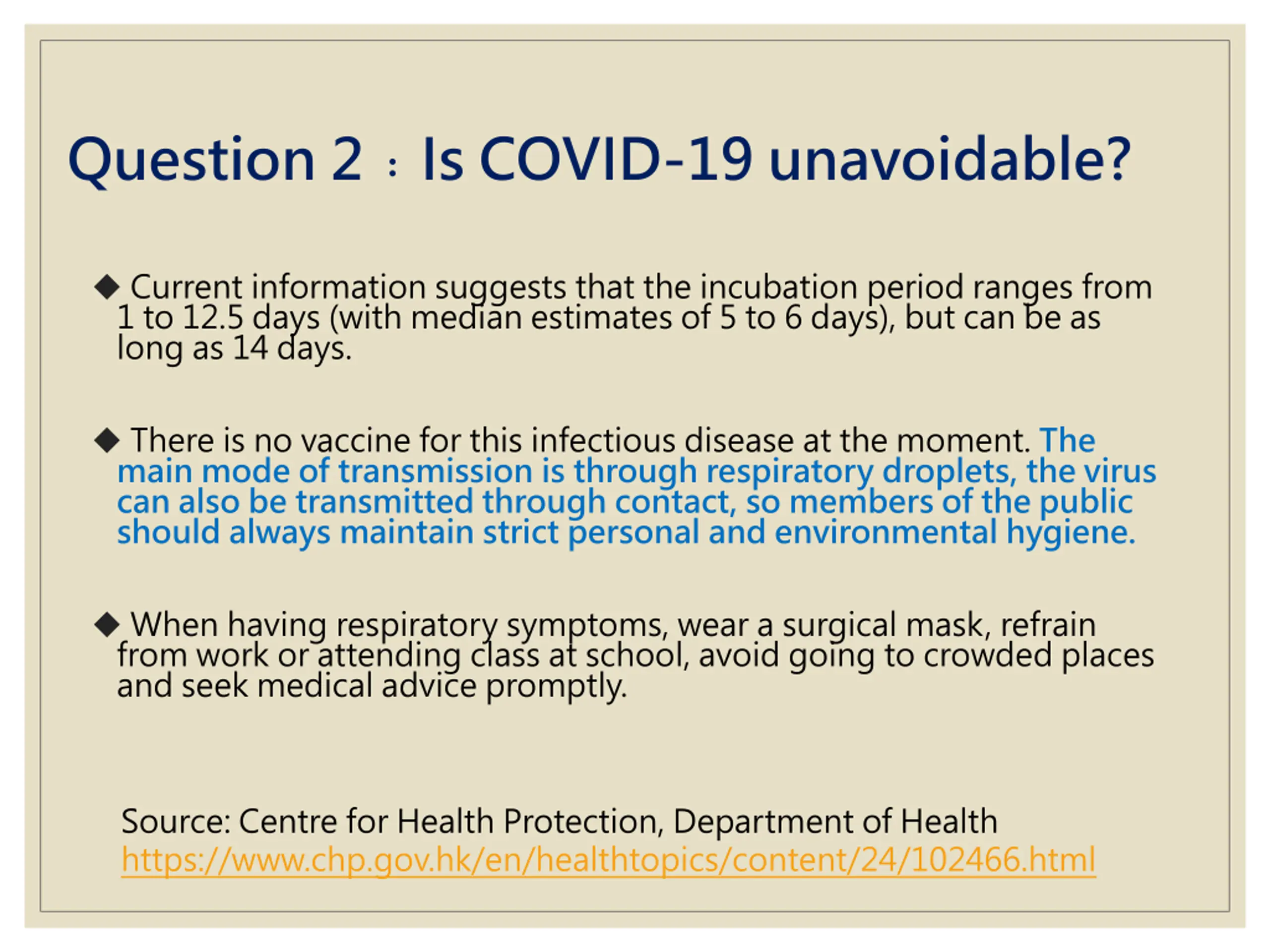 Question 2Is COVID-19 unavoidable? Current information suggests that the incubation period ranges from 1 to 12.5 days (with median estimates of 5 to 6 days), but can be as long as 14 days. There is no vaccine for this infectious disease at the moment. The main mode of transmission is through respiratory droplets, the virus can also be transmitted through contact, so members of the public should always maintain strict personal and environmental hygiene. When having respiratory symptoms, wear a surgical mask, refrain from work or attending class at school, avoid going to crowded places and seek medical advice promptly. Source: Centre for Health Protection, Department of Health https://www.chp.gov.hk/en/healthtopics/content/24/102466.html