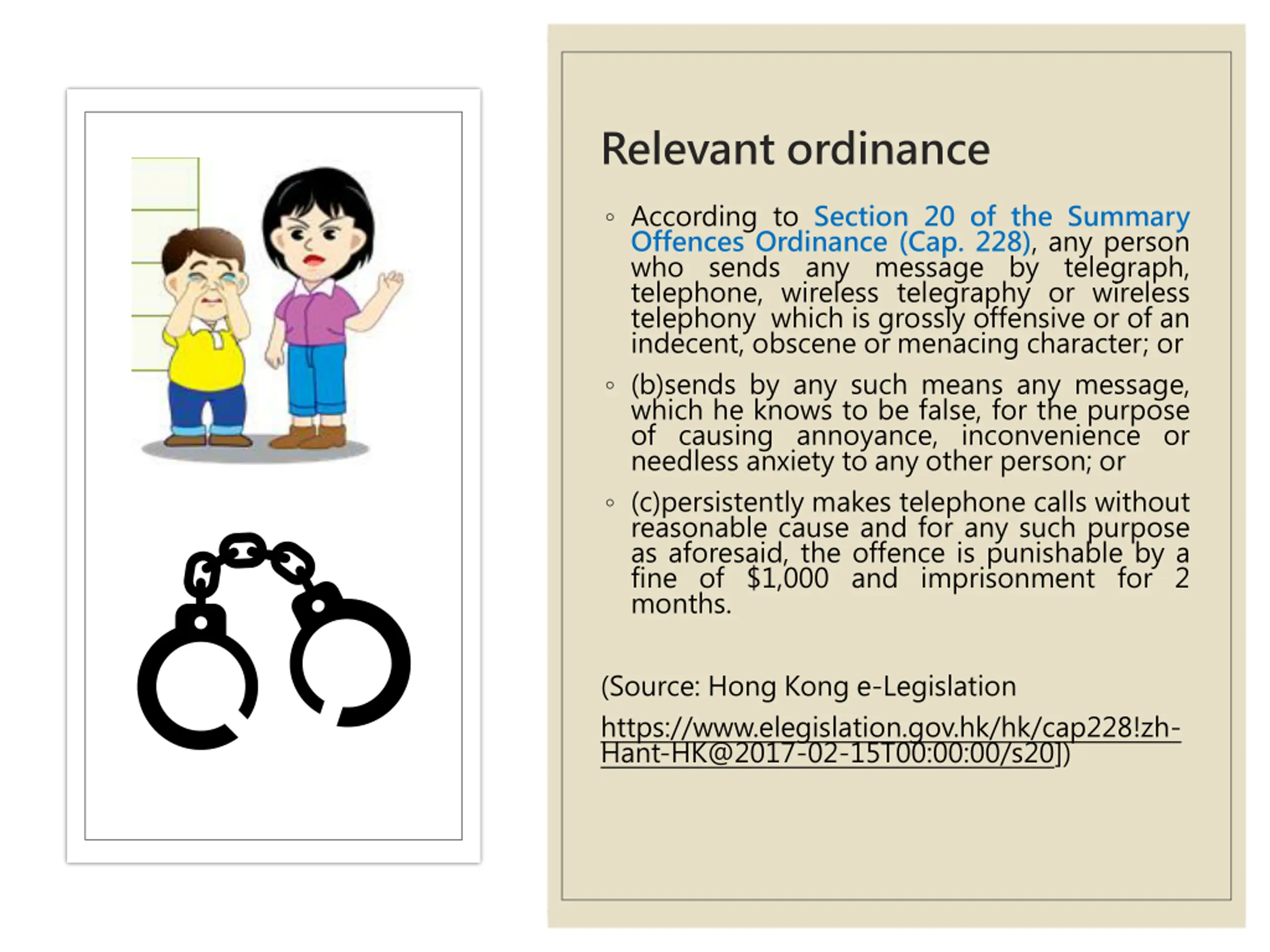 Relevant ordinance According to Section 20 of the Summary Offences Ordinance (Cap. 228), any person who sends any message by telegraph, telephone, wireless telegraphy or wireless telephony which is grossly offensive or of an indecent, obscene or menacing character; or (b)sends by any such means any message, which he knows to be false, for the purpose of causing annoyance, inconvenience or needless anxiety to any other person; or (c)persistently makes telephone calls without reasonable cause and for any such purpose as aforesaid, the offence is punishable by a fine of $1,000 and imprisonment for 2 months. (Source: Hong Kong e-Legislation https://www.elegislation.gov.hk/hk/cap228!zh- Hant-HK@2017-02-15T00:00:00/s20])