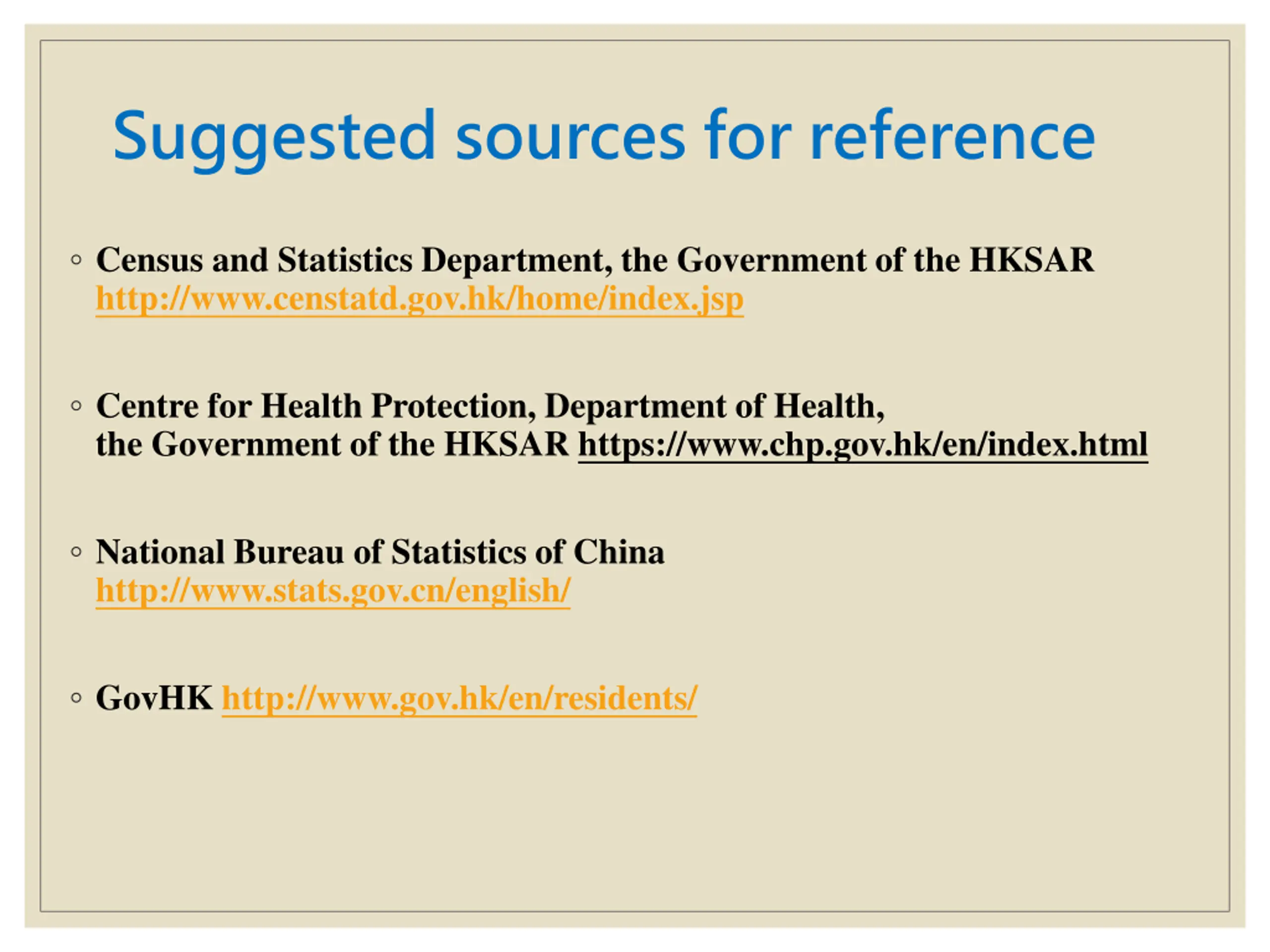Suggested sources for reference Census and Statistics Department, the Government of the HKSAR http://www.censtatd.gov.hk/home/index.jsp Centre for Health Protection, Department of Health, the Government of the HKSAR https://www.chp.gov.hk/en/index.html National Bureau of Statistics of China http://www.stats.gov.cn/english/ GovHK http://www.gov.hk/en/residents/