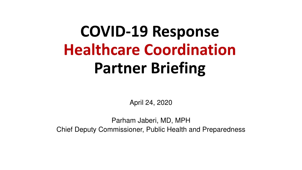 COVID-19 Response Healthcare Coordination Partner Briefing April 24, 2020 Parham Jaberi, MD, MPH Chief Deputy Commissioner, Public Health and Preparedness