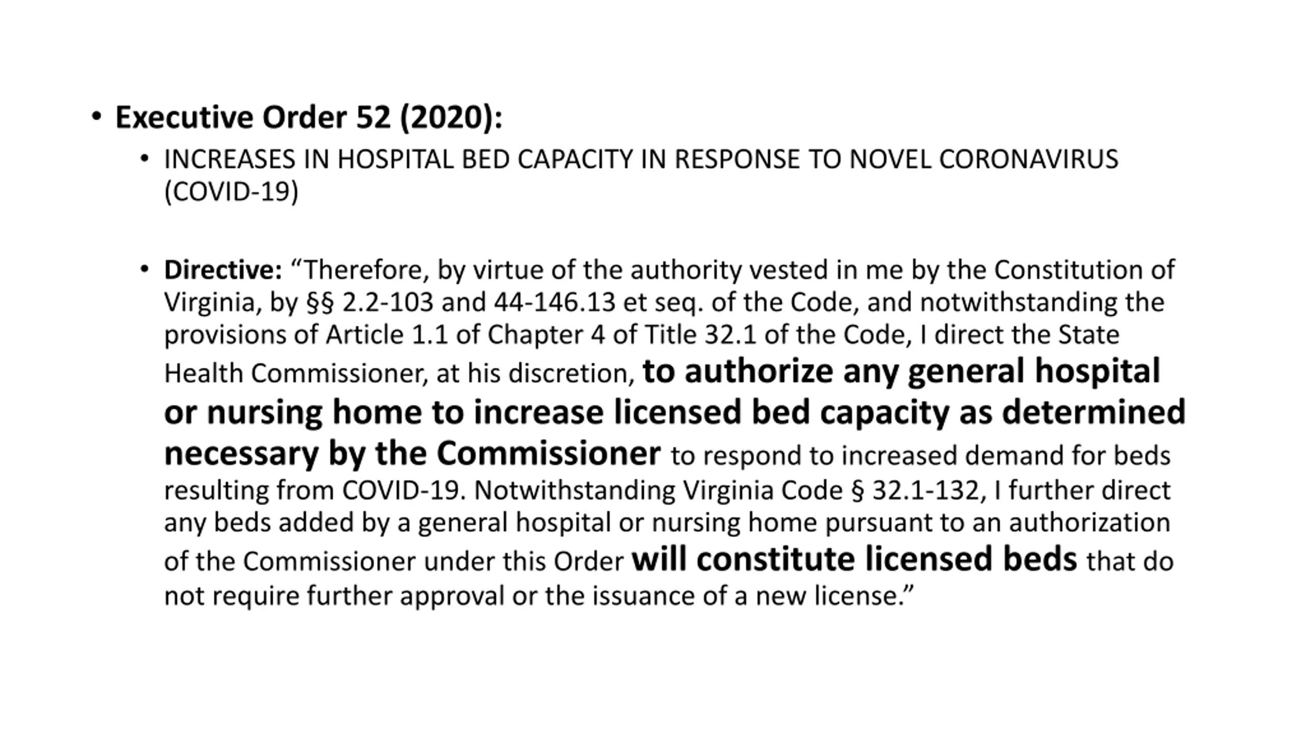 Executive Order 52 (2020): INCREASES IN HOSPITAL BED CAPACITY IN RESPONSE TO NOVEL CORONAVIRUS (COVID-19) Directive: Therefore, by virtue of the authority vested in me by the Constitution of Virginia, by 2.2-103 and 44-146.13 et seq. of the Code, and notwithstanding the provisions of Article 1.1 of Chapter 4 of Title 32.1 of the Code, I direct the State Health Commissioner, at his discretion, to authorize any general hospital or nursing home to increase licensed bed capacity as determined necessary by the Commissionerto respond to increased demand for beds resulting from COVID-19. Notwithstanding Virginia Code 32.1-132, I further direct any beds added by a general hospital or nursing home pursuant to an authorization of the Commissioner under this Order will constitute licensed beds that do not require further approval or the issuance of a new license.