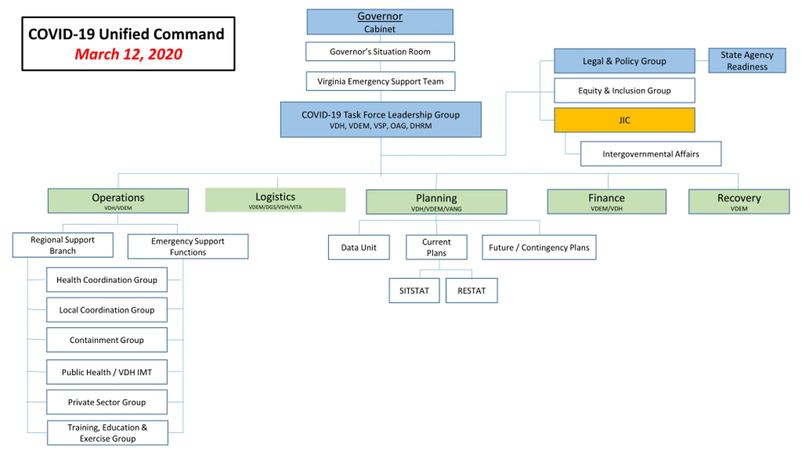 Governor Cabinet COVID-19 Unified Command March 12, 2020 Governor s Situation Room State Agency Readiness Legal & Policy Group Virginia Emergency Support Team Equity & Inclusion Group COVID-19 Task Force Leadership Group VDH, VDEM, VSP, OAG, DHRM JIC Intergovernmental Affairs Logistics VDEM/DGS/VDH/VITA Operations VDH/VDEM Finance VDEM/VDH Recovery VDEM Planning VDH/VDEM/VANG Regional Support Branch Emergency Support Functions Current Plans Data Unit Future / Contingency Plans Health Coordination Group SITSTAT RESTAT Local Coordination Group Containment Group Public Health / VDH IMT Private Sector Group Training, Education & Exercise Group
