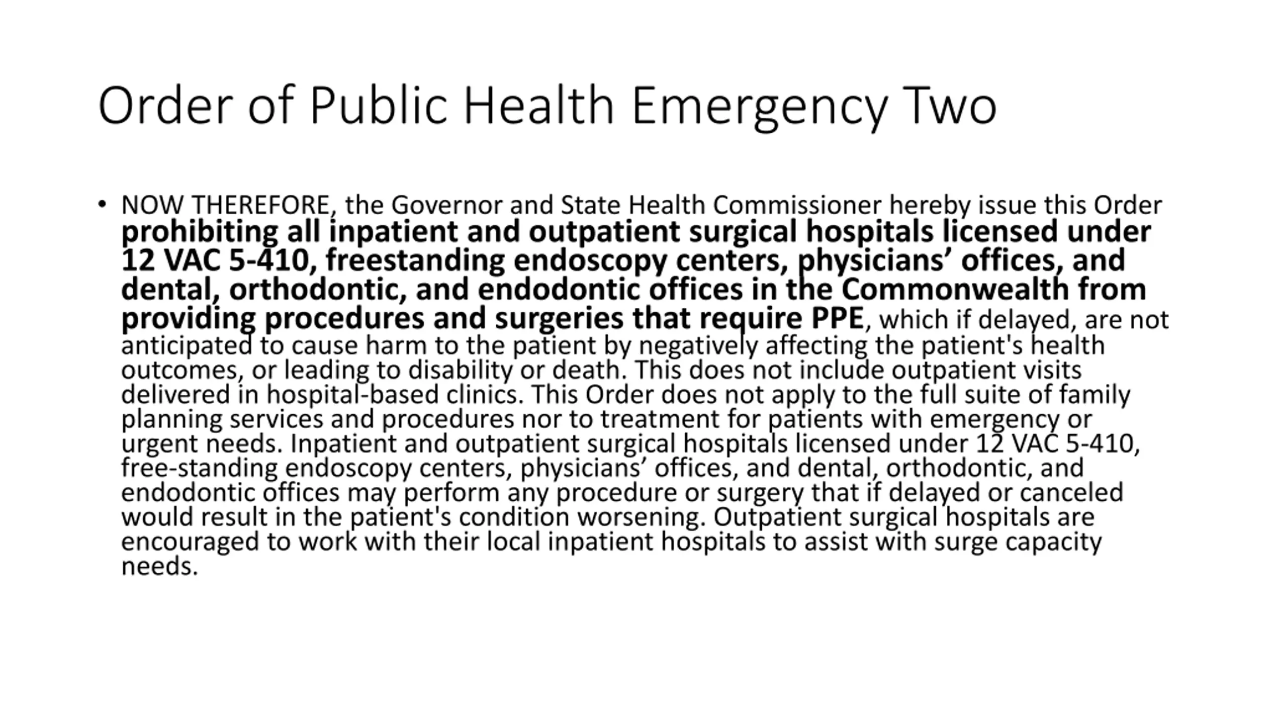Order of Public Health Emergency Two NOW THEREFORE, the Governor and State Health Commissioner hereby issue this Order prohibiting all inpatient and outpatient surgical hospitals licensed under 12 VAC 5-410, freestanding endoscopy centers, physicians offices, and dental, orthodontic, and endodontic offices in the Commonwealth from providing procedures and surgeries that require PPE, which if delayed, are not anticipated to cause harm to the patient by negatively affecting the patient's health outcomes, or leading to disability or death. This does not include outpatient visits delivered in hospital-based clinics. This Order does not apply to the full suite of family planning services and procedures nor to treatment for patients with emergency or urgent needs. Inpatient and outpatient surgical hospitals licensed under 12 VAC 5-410, free-standing endoscopy centers, physicians offices, and dental, orthodontic, and endodontic offices may perform any procedure or surgery that if delayed or canceled would result in the patient's condition worsening. Outpatient surgical hospitals are encouraged to work with their local inpatient hospitals to assist with surge capacity needs.