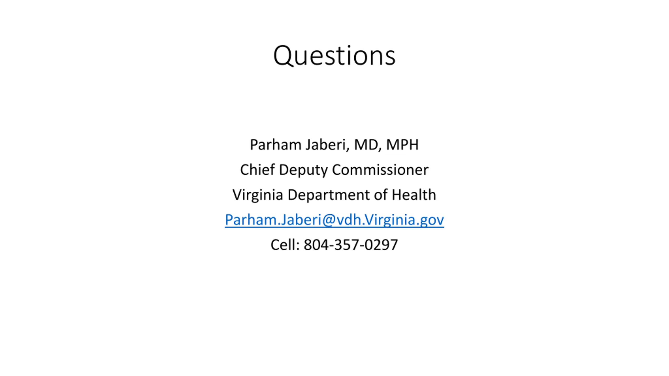 Questions Parham Jaberi, MD, MPH Chief Deputy Commissioner Virginia Department of Health Parham.Jaberi@vdh.Virginia.gov Cell: 804-357-0297