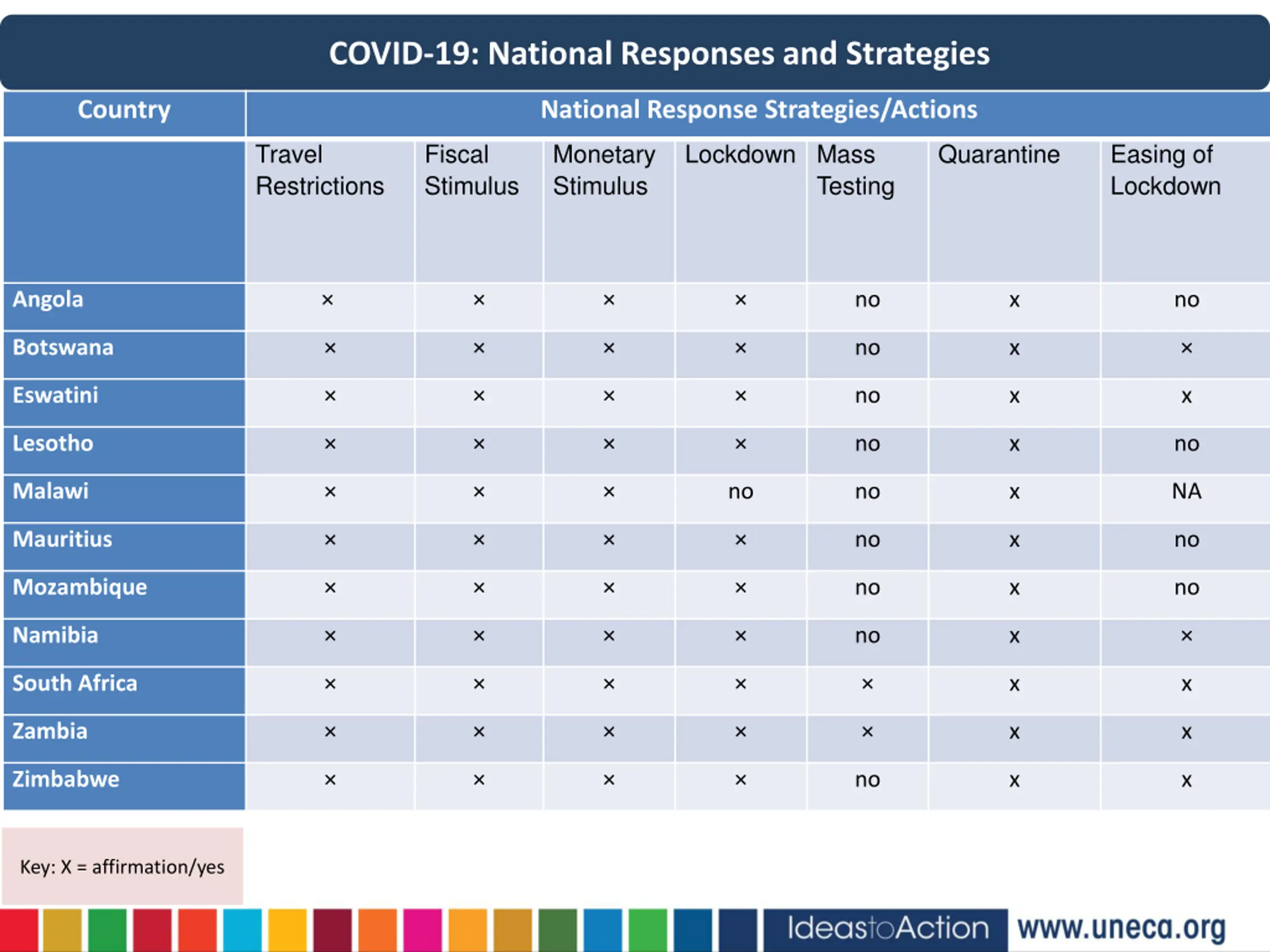 COVID-19: National Responses and Strategies Country National Response Strategies/Actions Travel Restrictions Fiscal Stimulus Monetary Stimulus Lockdown Mass Quarantine Easing of Lockdown Testing Angola no x no Botswana no x Eswatini no x x Lesotho no x no Malawi no no x NA Mauritius no x no Mozambique no x no Namibia no x South Africa x x Zambia x x Zimbabwe no x x Key: X = affirmation/yes