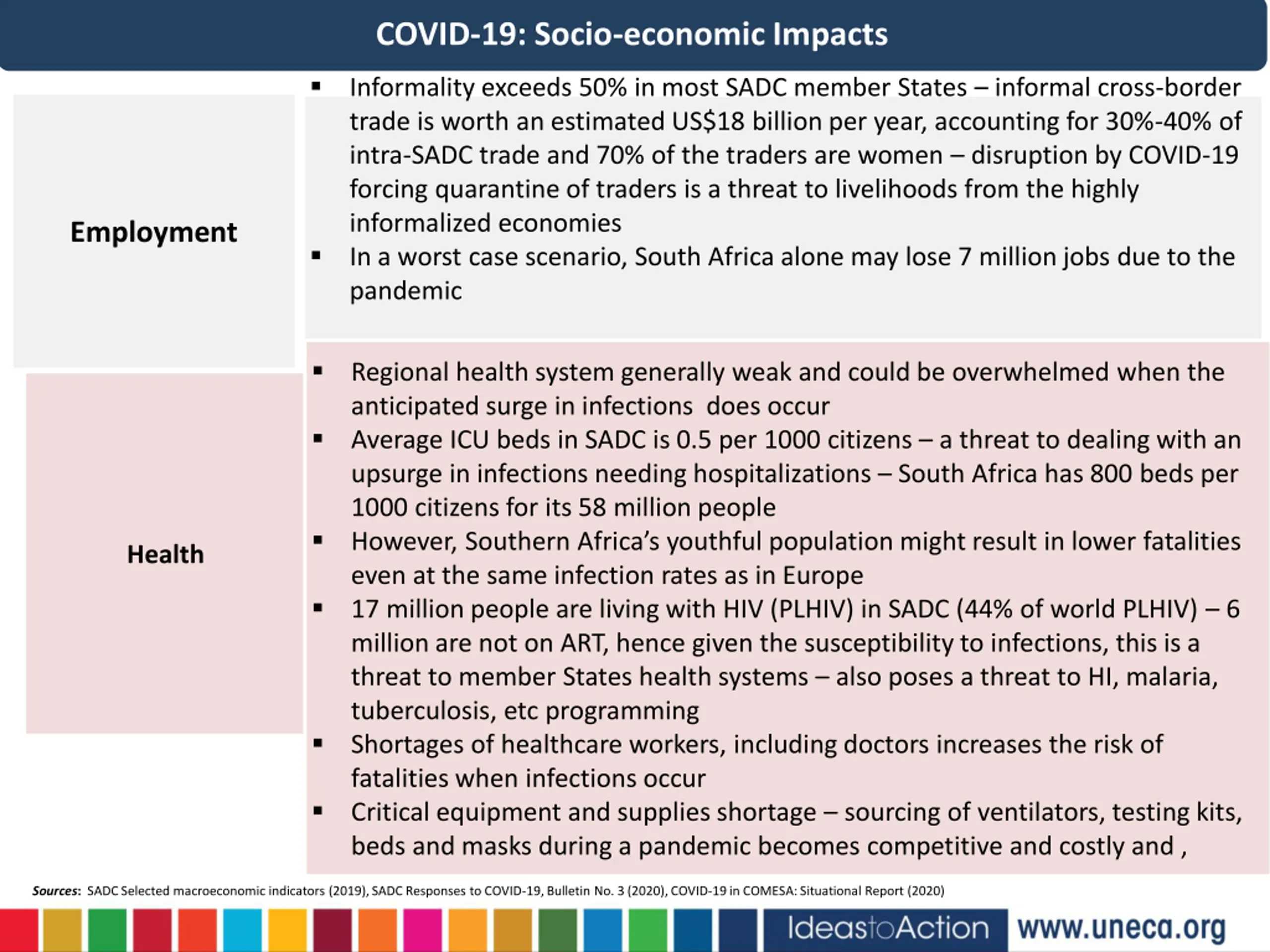 COVID-19: Socio-economic Impacts Informality exceeds 50% in most SADC member States informal cross-border trade is worth an estimated US$18 billion per year, accounting for 30%-40% of intra-SADC trade and 70% of the traders are women disruption by COVID-19 forcing quarantine of traders is a threat to livelihoods from the highly informalized economies In a worst case scenario, South Africa alone may lose 7 million jobs due to the pandemic Employment Regional health system generally weak and could be overwhelmed when the anticipated surge in infections does occur Average ICU beds in SADC is 0.5 per 1000 citizens a threat to dealing with an upsurge in infections needing hospitalizations South Africa has 800 beds per 1000 citizens for its 58 million people However, Southern Africa s youthful population might result in lower fatalities even at the same infection rates as in Europe 17 million people are living with HIV (PLHIV) in SADC (44% of world PLHIV) 6 million are not on ART, hence given the susceptibility to infections, this is a threat to member States health systems also poses a threat to HI, malaria, tuberculosis, etc programming Shortages of healthcare workers, including doctors increases the risk of fatalities when infections occur Critical equipment and supplies shortage sourcing of ventilators, testing kits, beds and masks during a pandemic becomes competitive and costly and , Health Sources: SADC Selected macroeconomic indicators (2019), SADC Responses to COVID-19, Bulletin No. 3 (2020), COVID-19 in COMESA: Situational Report (2020)
