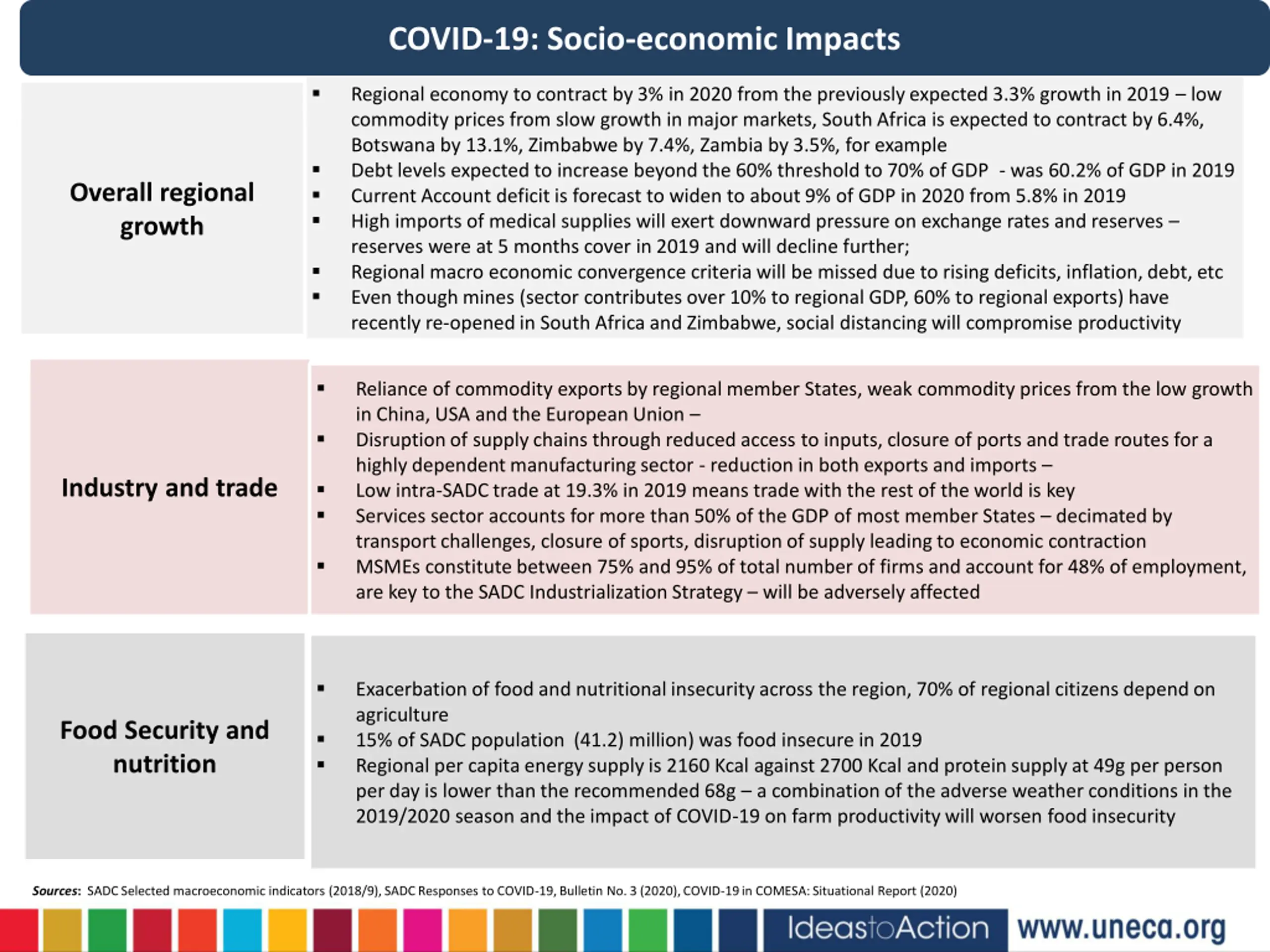 COVID-19: Socio-economic Impacts Regional economy to contract by 3% in 2020 from the previously expected 3.3% growth in 2019 low commodity prices from slow growth in major markets, South Africa is expected to contract by 6.4%, Botswana by 13.1%, Zimbabwe by 7.4%, Zambia by 3.5%, for example Debt levels expected to increase beyond the 60% threshold to 70% of GDP - was 60.2% of GDP in 2019 Current Account deficit is forecast to widen to about 9% of GDP in 2020 from 5.8% in 2019 High imports of medical supplies will exert downward pressure on exchange rates and reserves reserves were at 5 months cover in 2019 and will decline further; Regional macro economic convergence criteria will be missed due to rising deficits, inflation, debt, etc Even though mines (sector contributes over 10% to regional GDP, 60% to regional exports) have recently re-opened in South Africa and Zimbabwe, social distancing will compromise productivity Overall regional growth Reliance of commodity exports by regional member States, weak commodity prices from the low growth in China, USA and the European Union Disruption of supply chains through reduced access to inputs, closure of ports and trade routes for a highly dependent manufacturing sector - reduction in both exports and imports Low intra-SADC trade at 19.3% in 2019 means trade with the rest of the world is key Services sector accounts for more than 50% of the GDP of most member States decimated by transport challenges, closure of sports, disruption of supply leading to economic contraction MSMEs constitute between 75% and 95% of total number of firms and account for 48% of employment, are key to the SADC Industrialization Strategy will be adversely affected Industry and trade Exacerbation of food and nutritional insecurity across the region, 70% of regional citizens depend on agriculture 15% of SADC population (41.2) million) was food insecure in 2019 Regional per capita energy supply is 2160 Kcal against 2700 Kcal and protein supply at 49g per person per day is lower than the recommended 68g a combination of the adverse weather conditions in the 2019/2020 season and the impact of COVID-19 on farm productivity will worsen food insecurity Food Security and nutrition Sources: SADC Selected macroeconomic indicators (2018/9), SADC Responses to COVID-19, Bulletin No. 3 (2020), COVID-19 in COMESA: Situational Report (2020)