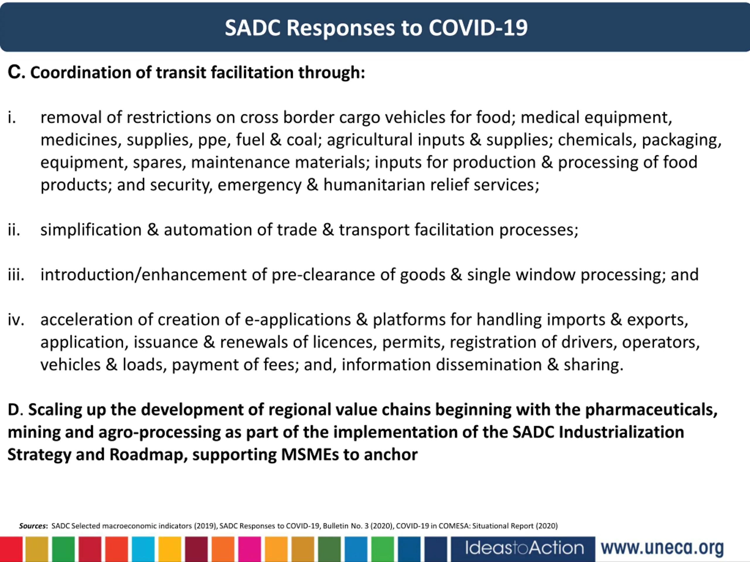 SADC Responses to COVID-19 C. Coordination of transit facilitation through: i. removal of restrictions on cross border cargo vehicles for food; medical equipment, medicines, supplies, ppe, fuel & coal; agricultural inputs & supplies; chemicals, packaging, equipment, spares, maintenance materials; inputs for production & processing of food products; and security, emergency & humanitarian relief services; ii. simplification & automation of trade & transport facilitation processes; iii. introduction/enhancement of pre-clearance of goods & single window processing; and iv. acceleration of creation of e-applications & platforms for handling imports & exports, application, issuance & renewals of licences, permits, registration of drivers, operators, vehicles & loads, payment of fees; and, information dissemination & sharing. D. Scaling up the development of regional value chains beginning with the pharmaceuticals, mining and agro-processing as part of the implementation of the SADC Industrialization Strategy and Roadmap, supporting MSMEs to anchor Sources: SADC Selected macroeconomic indicators (2019), SADC Responses to COVID-19, Bulletin No. 3 (2020), COVID-19 in COMESA: Situational Report (2020)